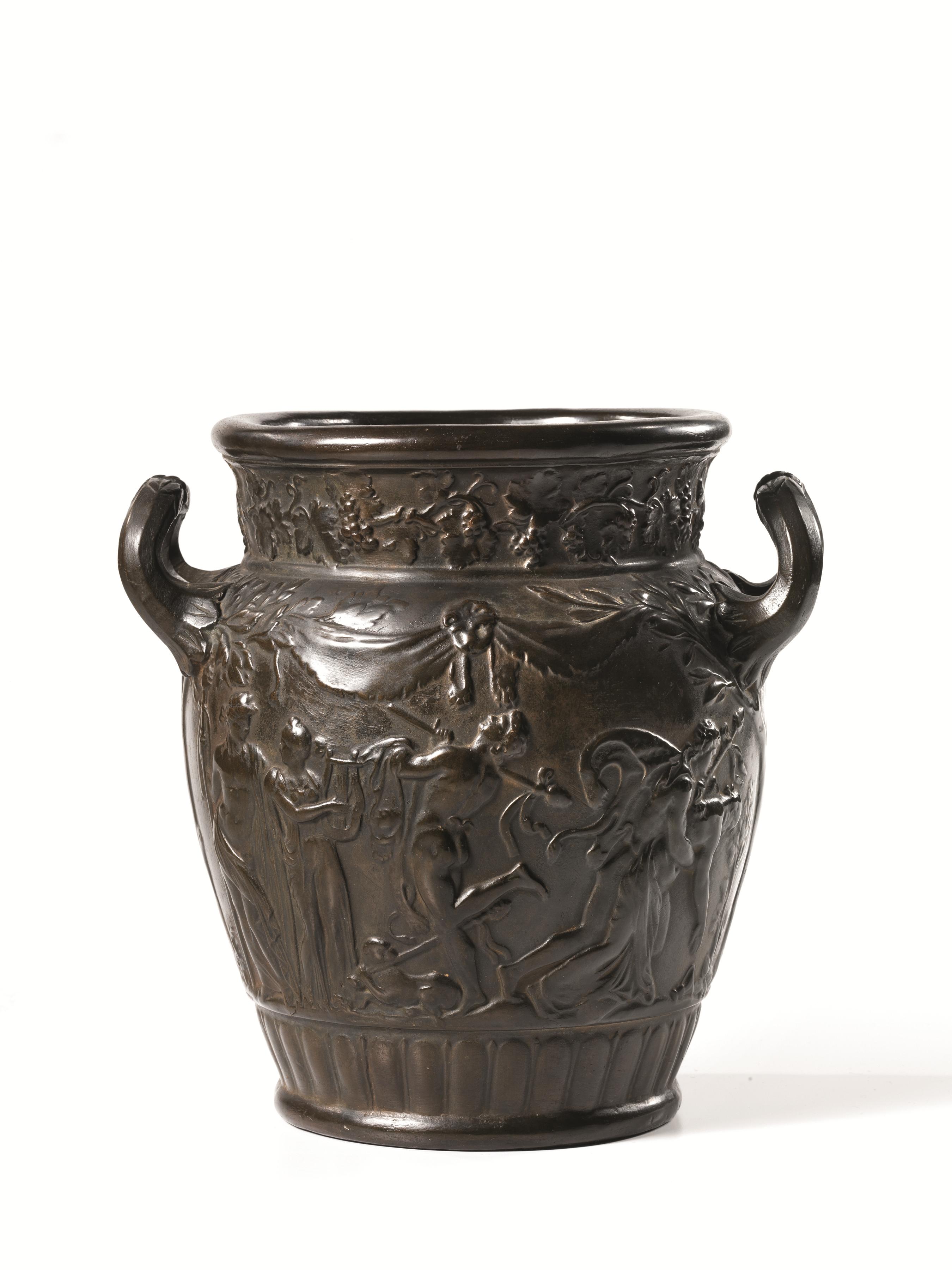Vaso, manifattura di Signa, inizi sec. XX, in terracotta patinata ad effetto bronzo e lavorata a bassorilievo a figure mitologiche, collo a viticci, alt. cm 23,5