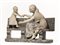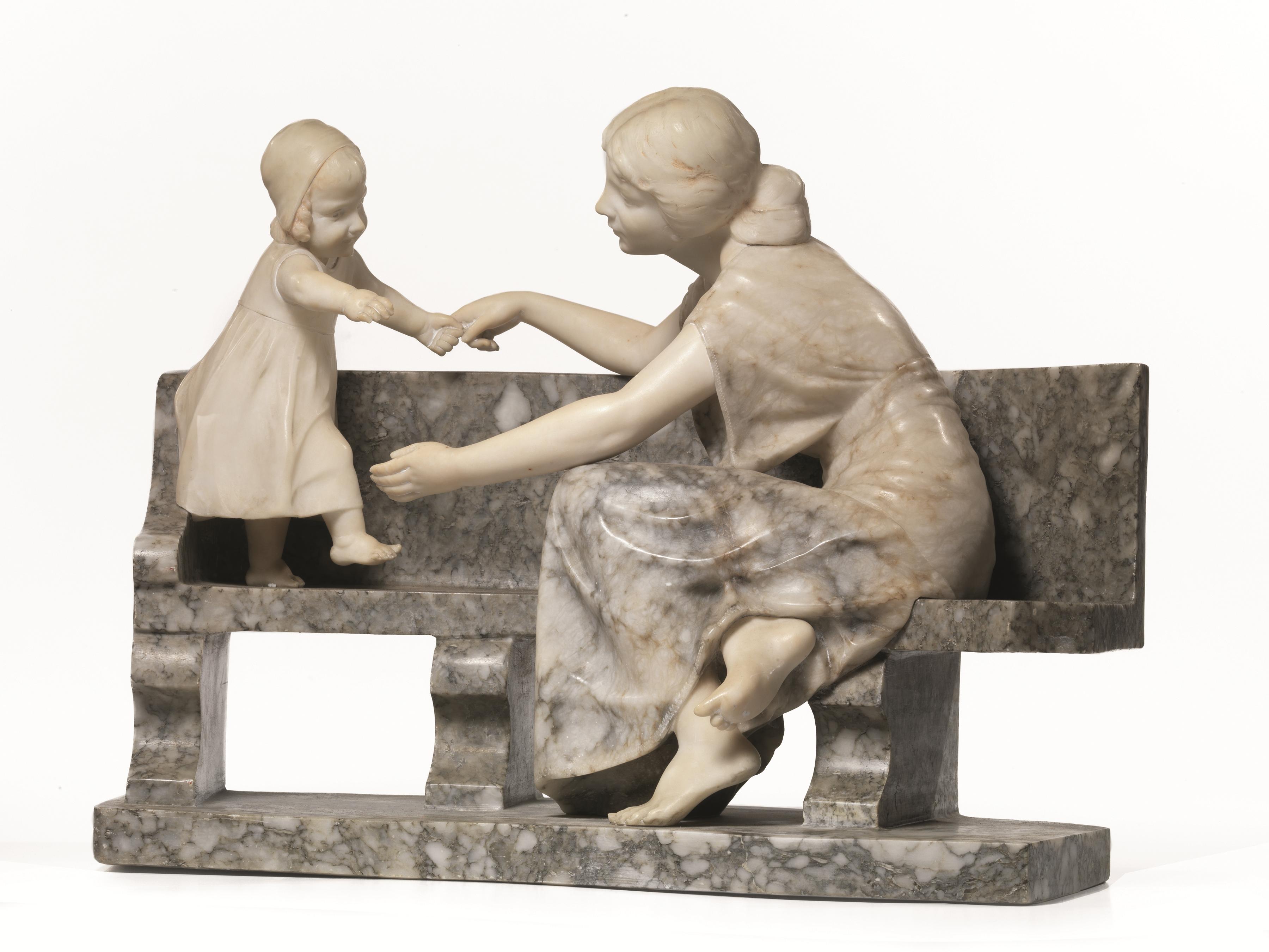 Scultura, sec. XX, in marmo bianco e grigio scolpito a figura di mamma con bambina su panchina, alt. cm 46, firmata Petrilli-Firenze, alcuni restauri