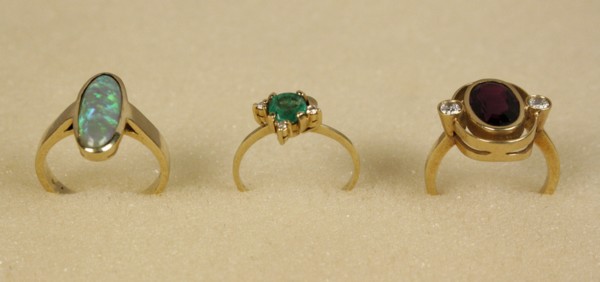 Firmato, datato. Tre anelli in oro giallo di cui uno con opale, uno con...
