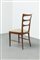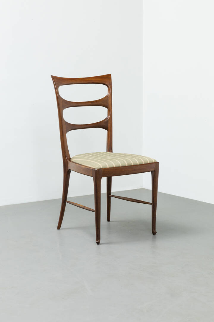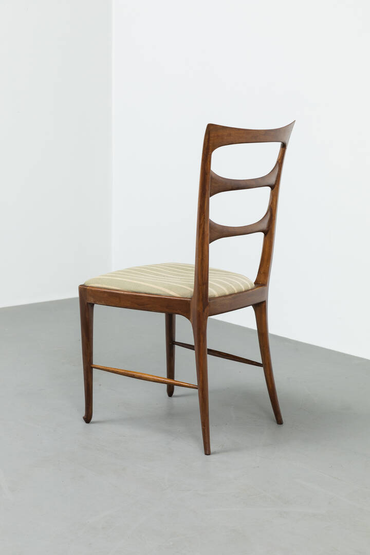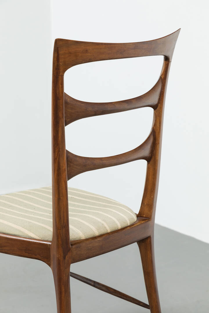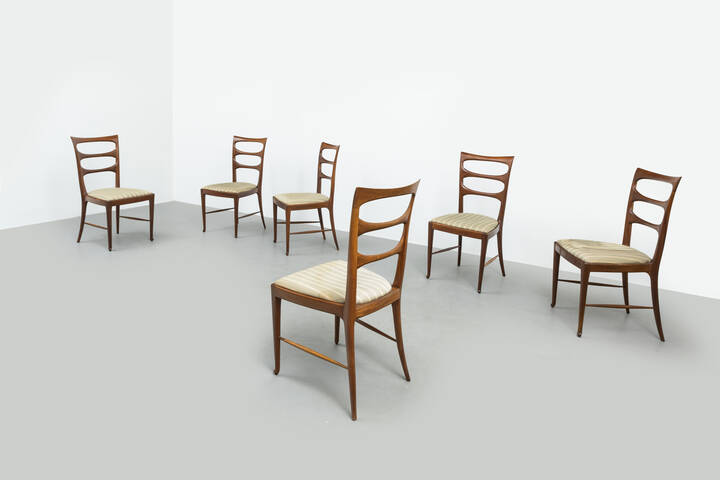 Sei sedie in legno di mogano, sedili imbottiti rivestiti in tessuto.