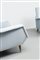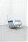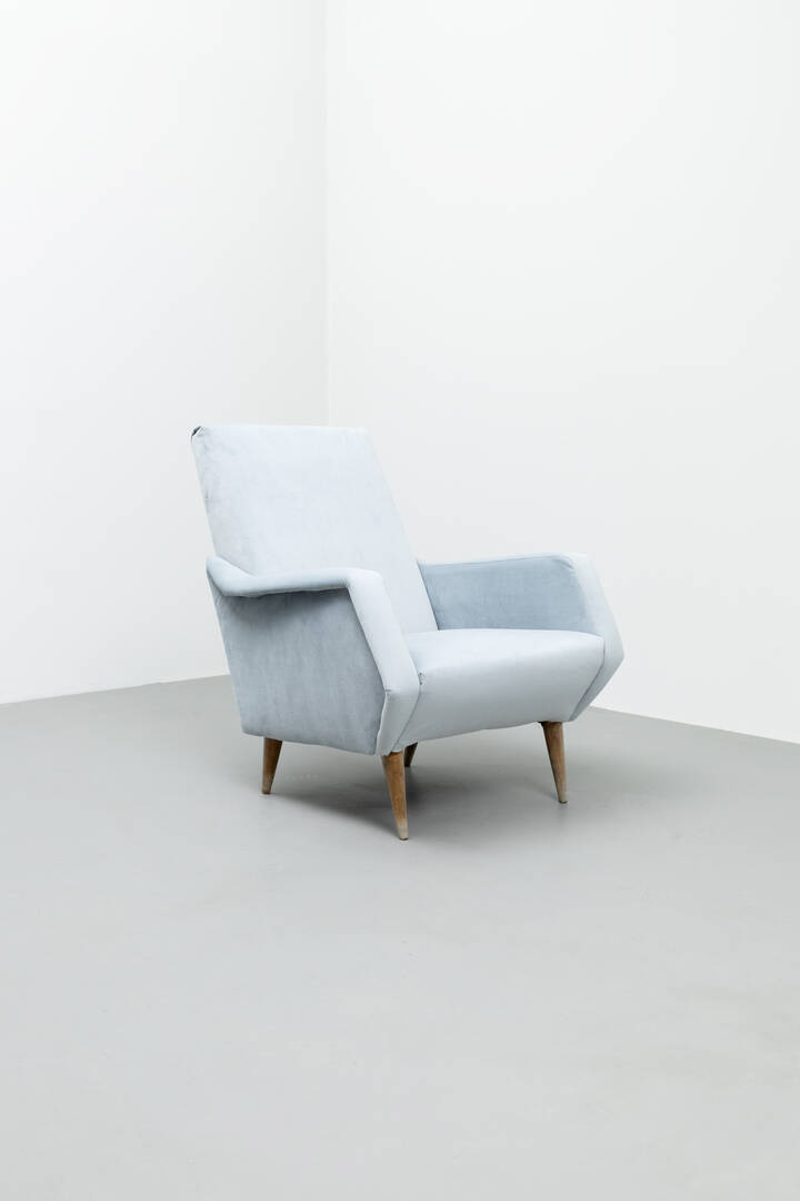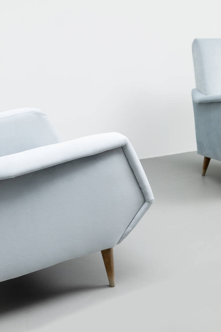 Coppia di poltrone con imbottitura rivestita in velluto, gambe coniche in legno.