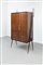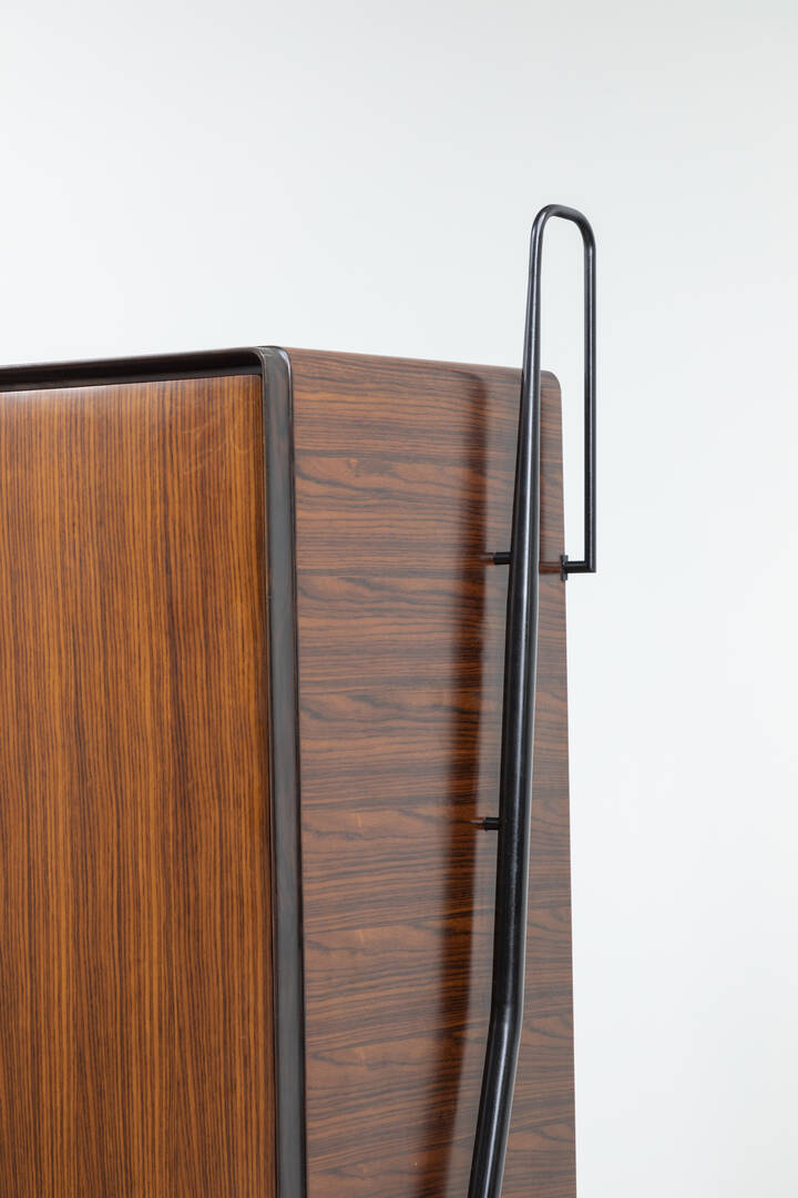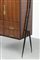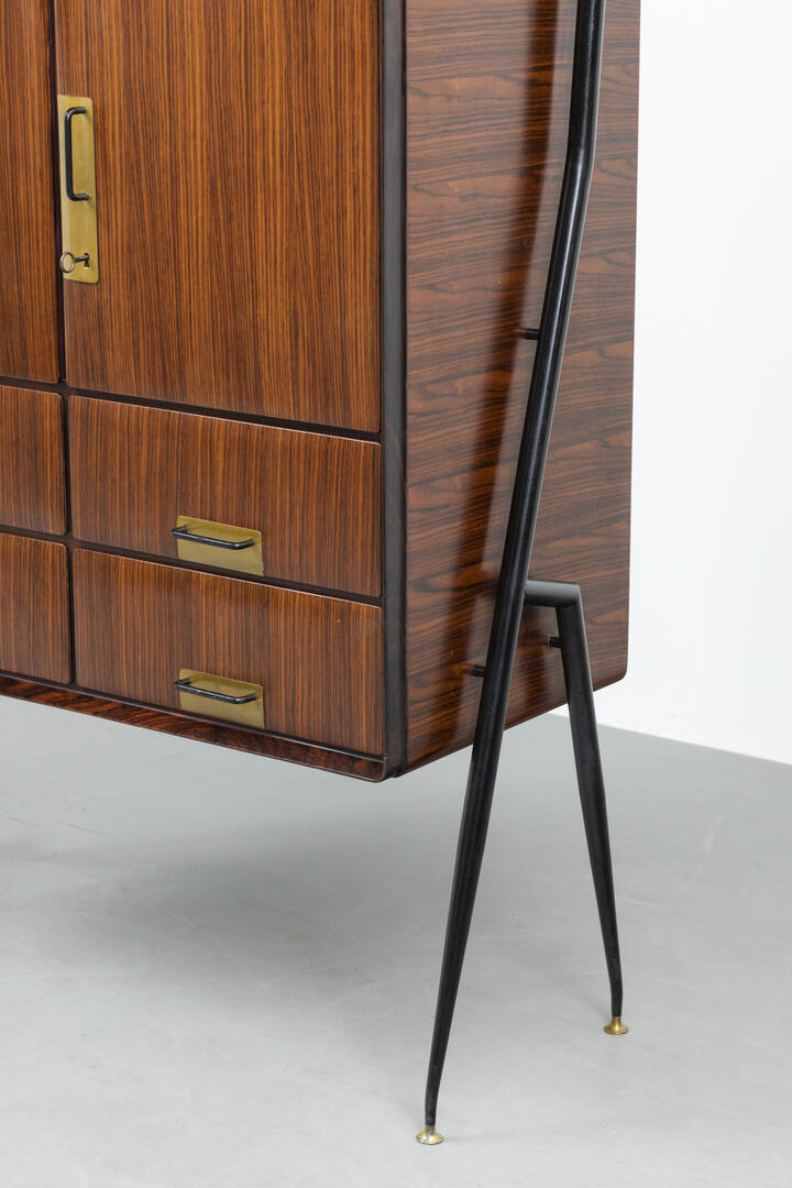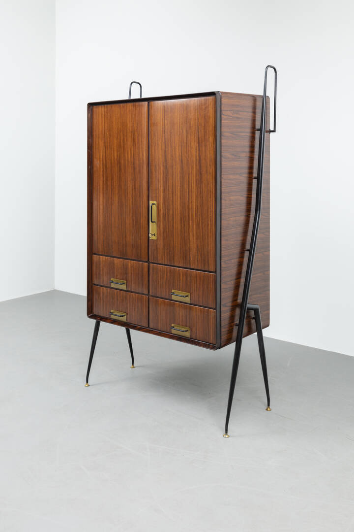 Mobile contenitore in legno con quattro cassetti, sostegni in metallo verniciato e particolari in ottone.
