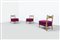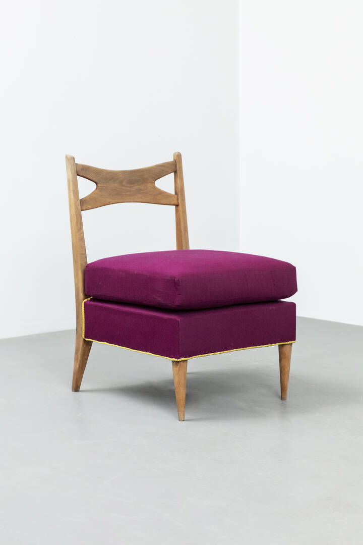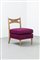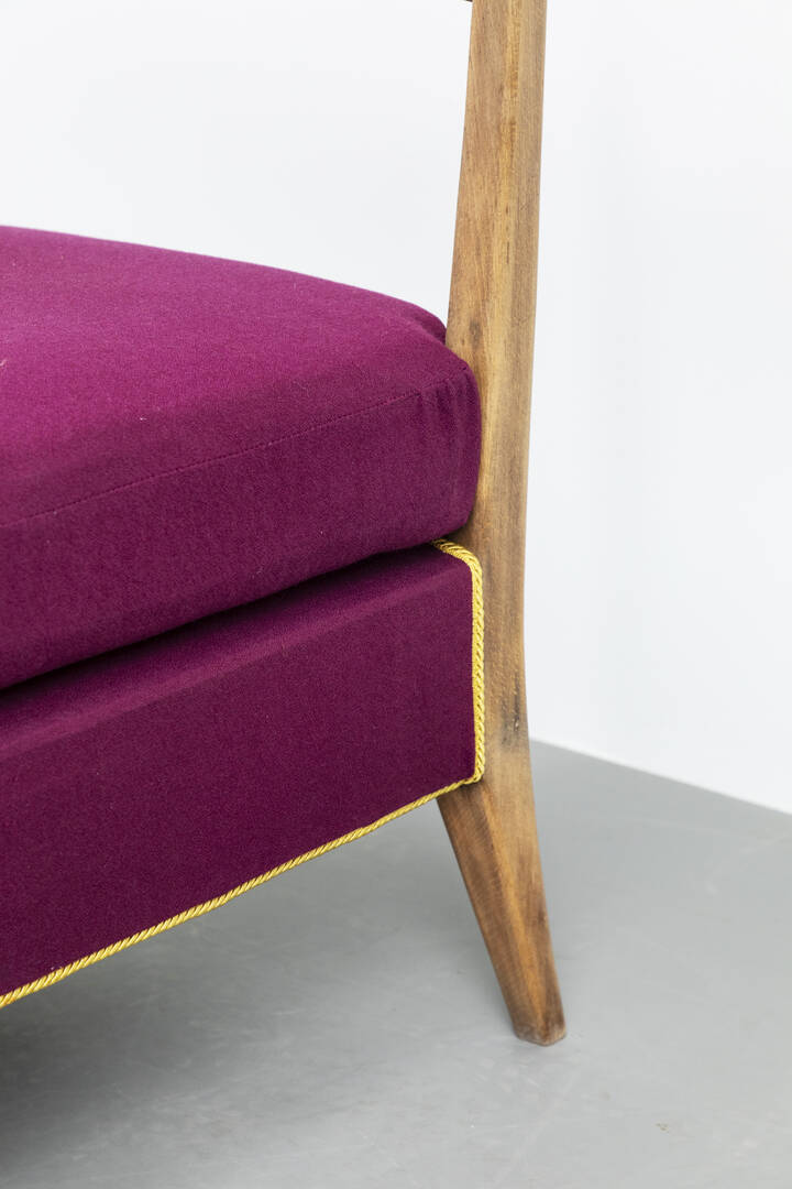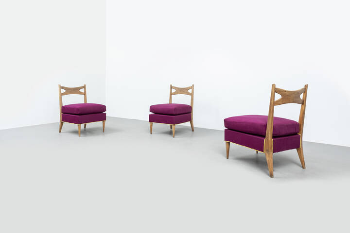 Tre poltrone con struttura in legno, imbottitura rivestita in tessuto.