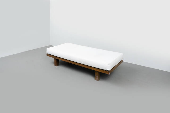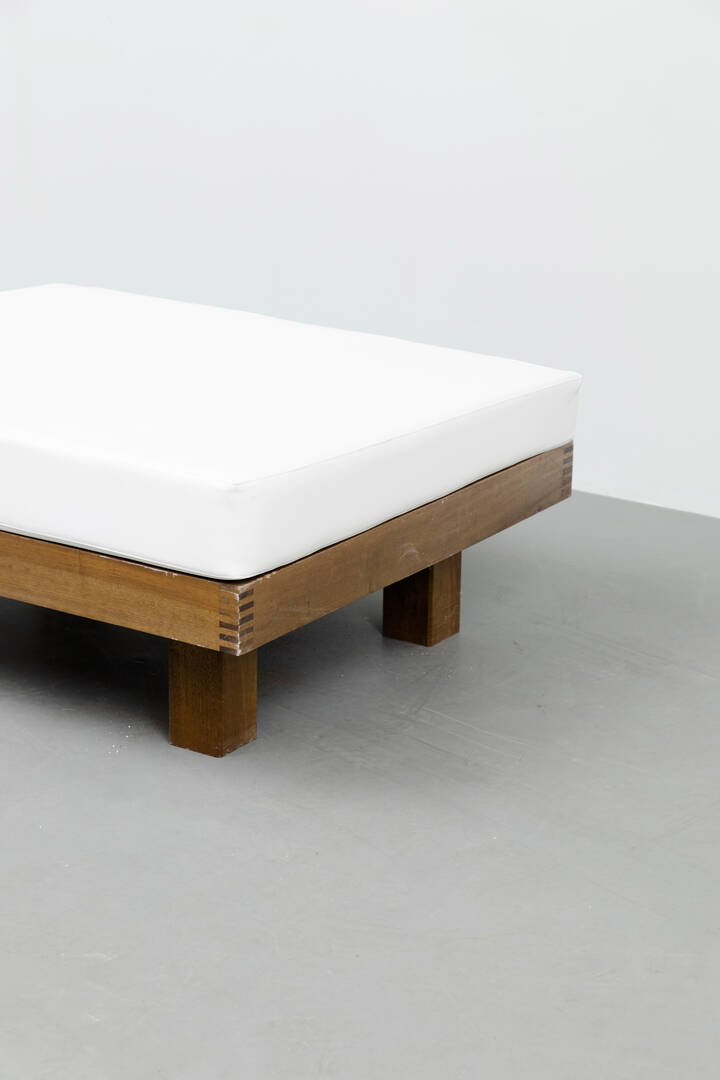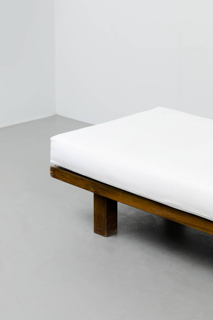 Day Bed in legno di noce e imbottitura in vinilpelle.