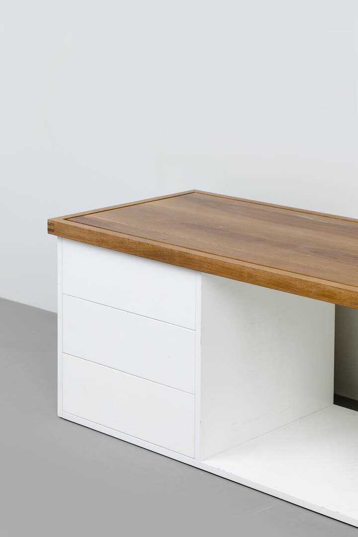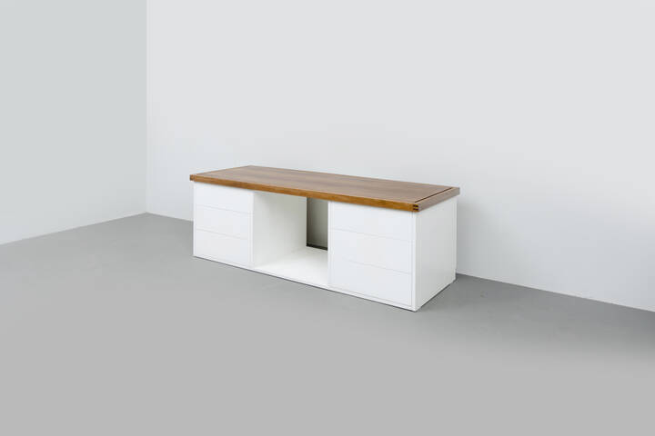 Mobile contenitore in legno laccato, piano in legno di noce.