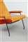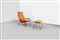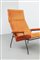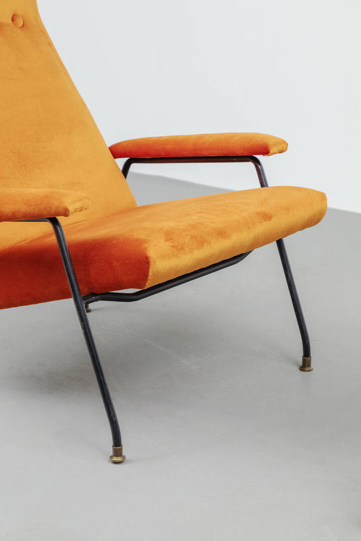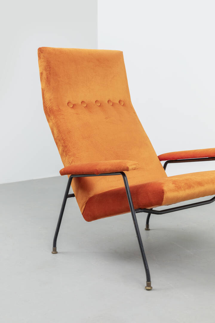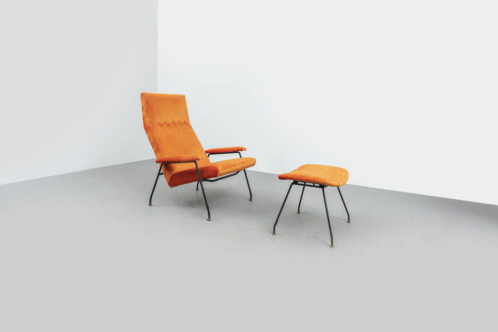 Poltrona con poggiapiedi in metallo verniciato, imbottitura rivestita in tessuto.