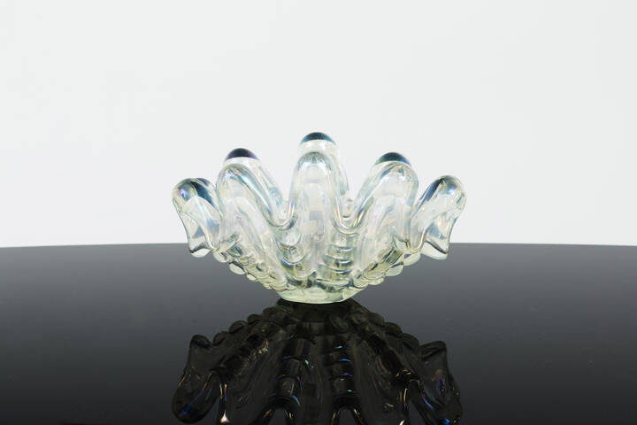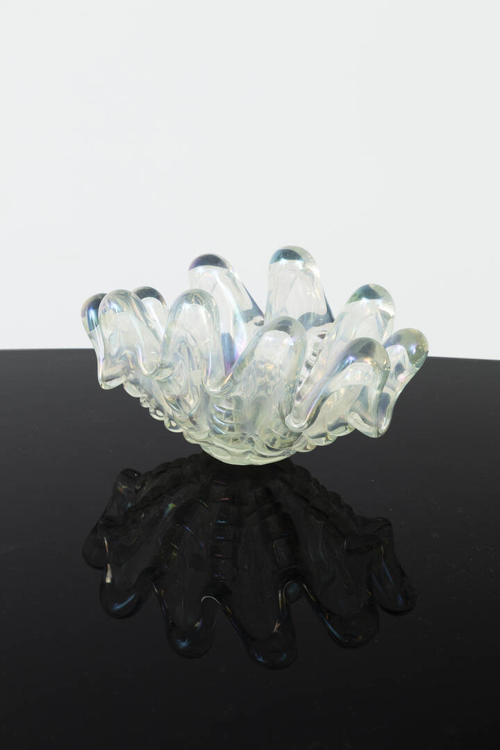 Centrotavola in vetro iridescente di forte spessore a forma di conchiglia.