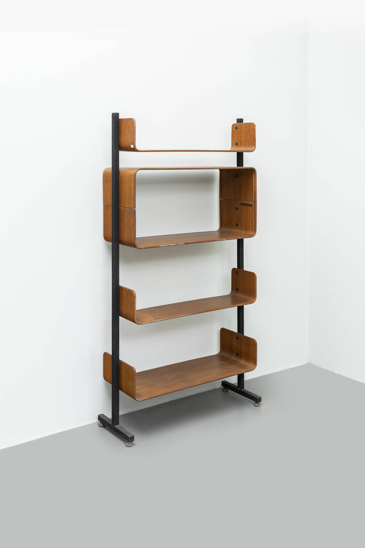 Libreria con montanti in metallo verniciato, piani in compensato cruvato.