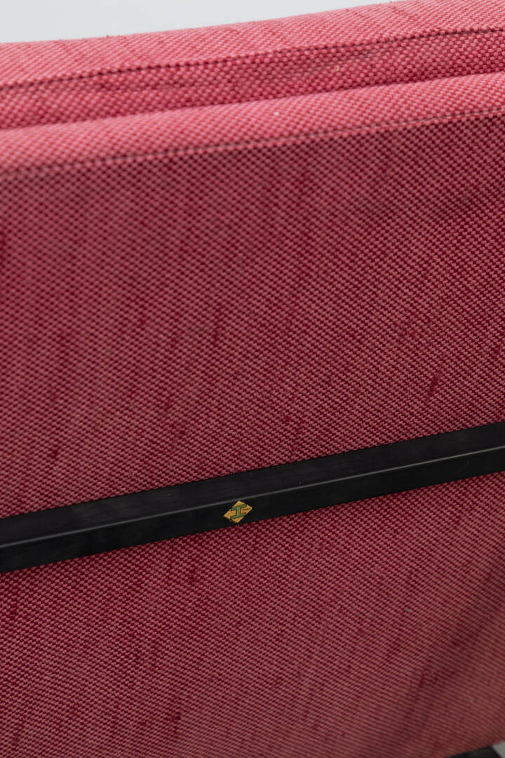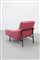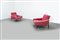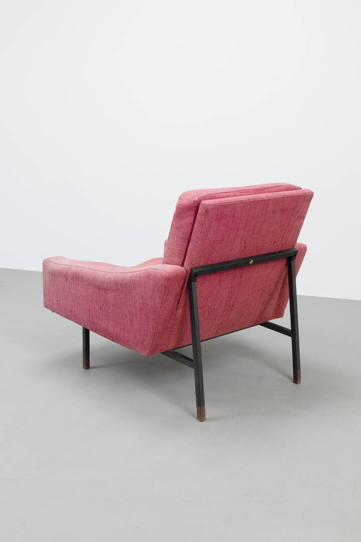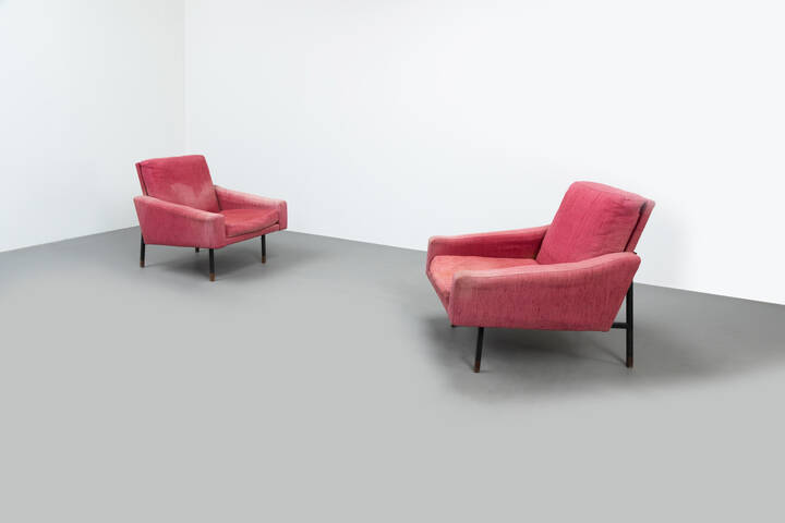 Coppia di poltrone con struttura in metallo verniciato, treminali in legno, imbottitura rivestita in tessuto.