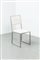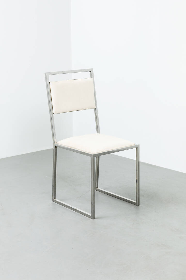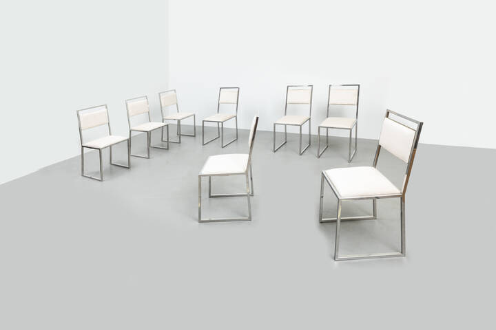 Otto sedie in metallo cromato e ottone con seduta imbottita rivestita in velluto.