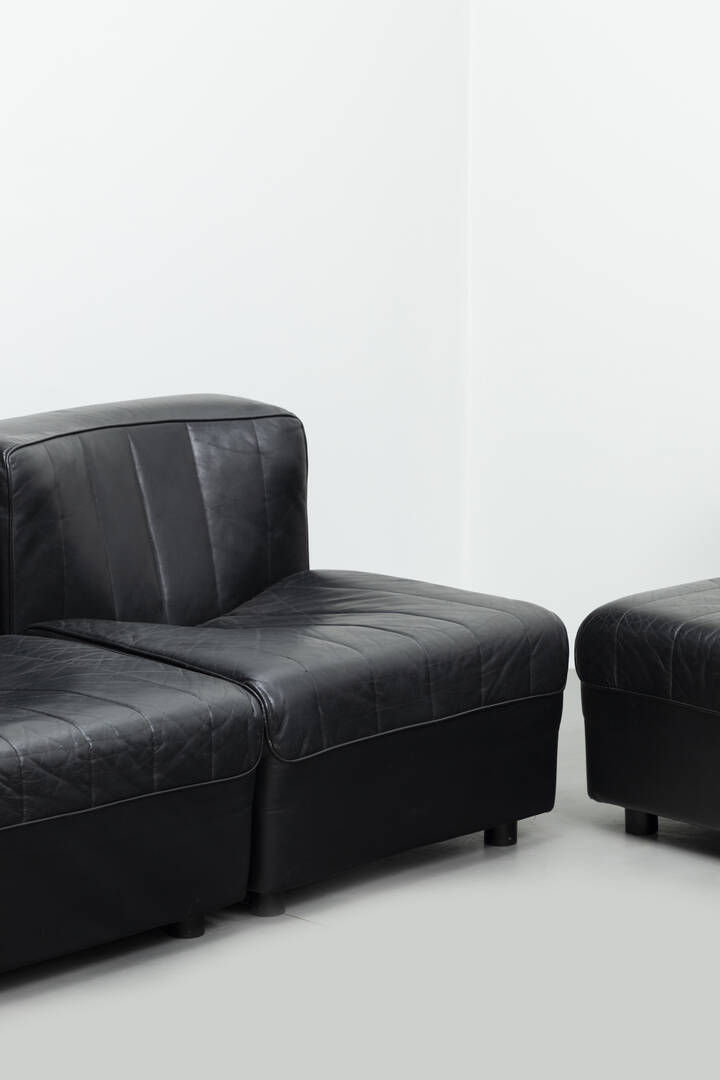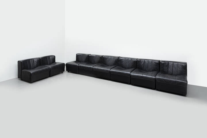 Divano modulare composo da otto poltrone con struttura in legno e rivestimenti in pelle.