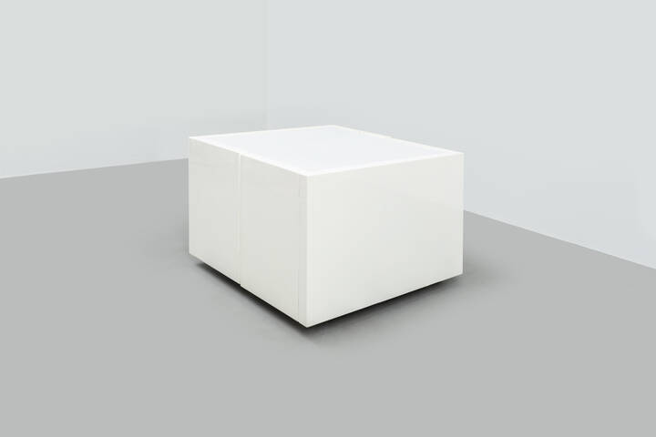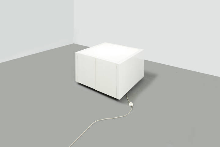 Tavolino contenitore con piano illuminato in legno laccato a poliestere.
