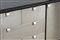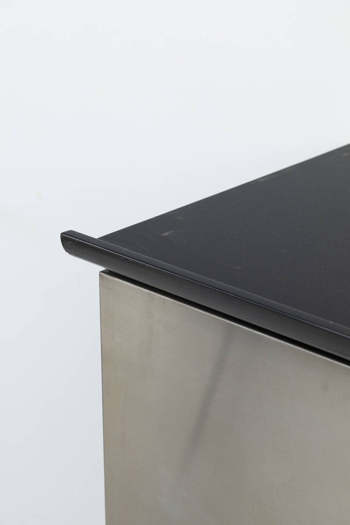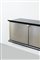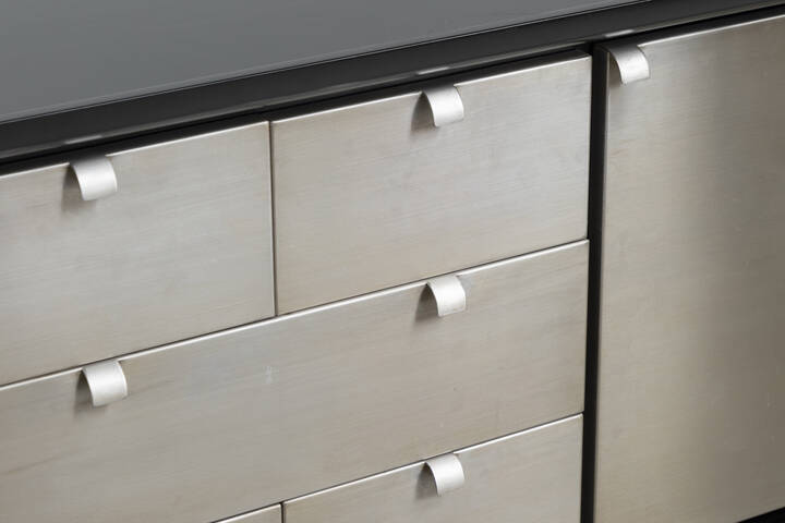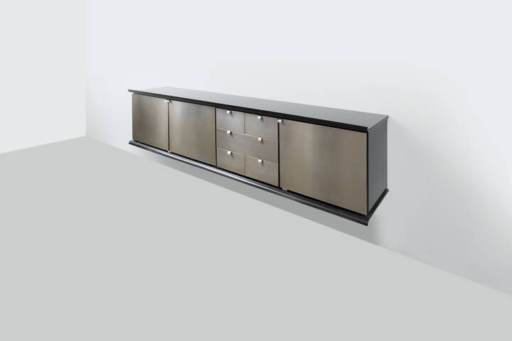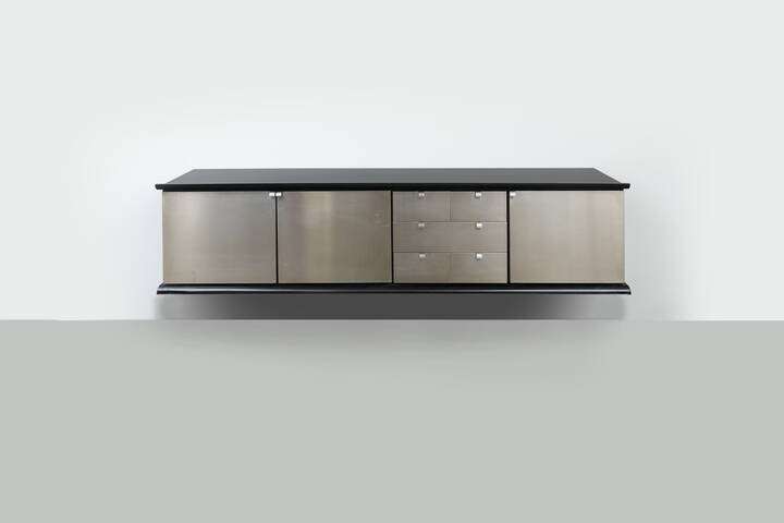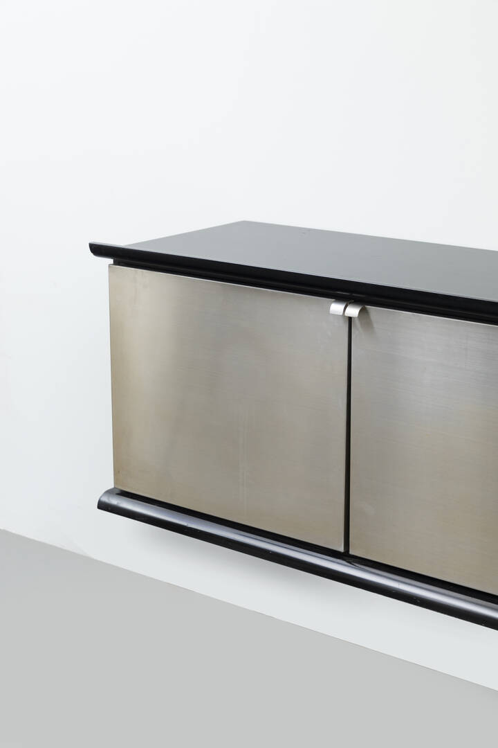 Credenza sospesa in legno laccato e legno laminato, rivestimento in acciaio.