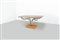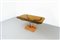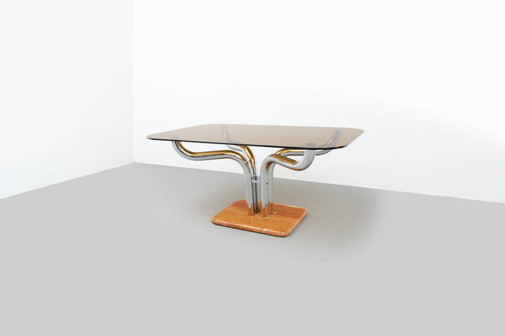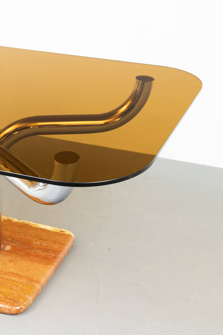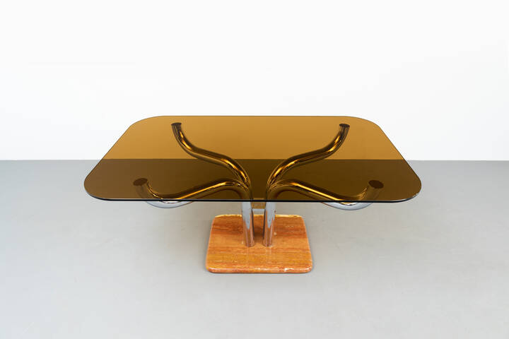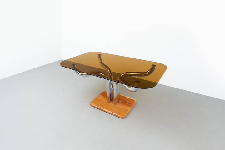 Tavolo in metallo cromato, base in marmo e paino in vetro fumé.