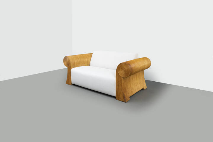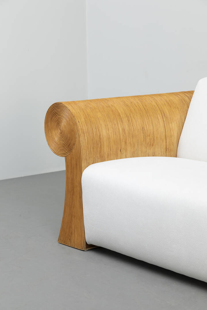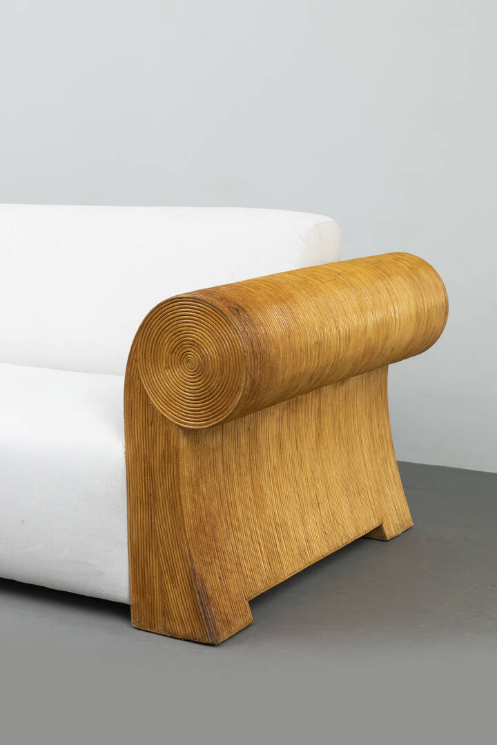 Divano con struttura in legno e canna d'India, imbottitura rivestita in tessuto.