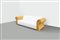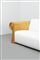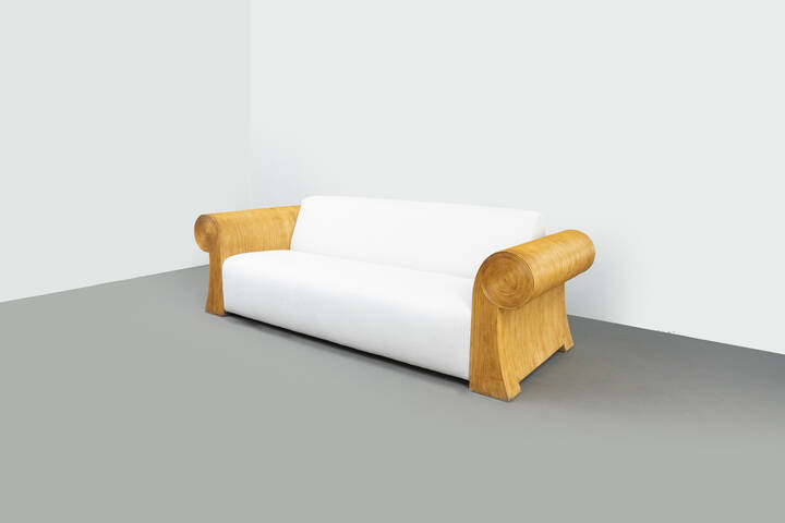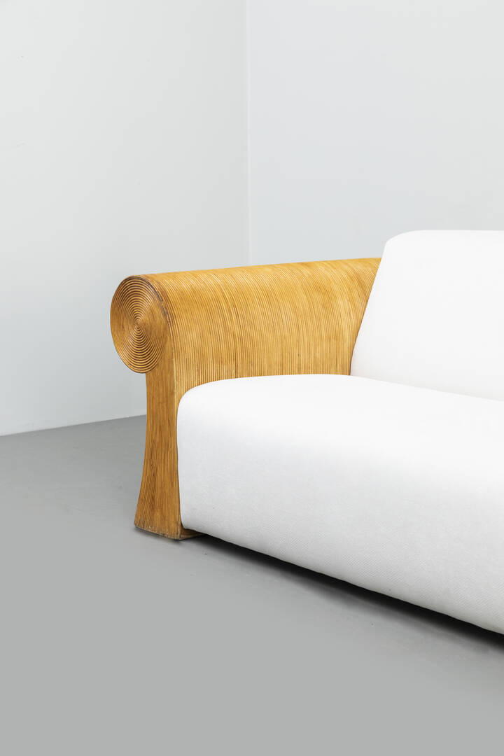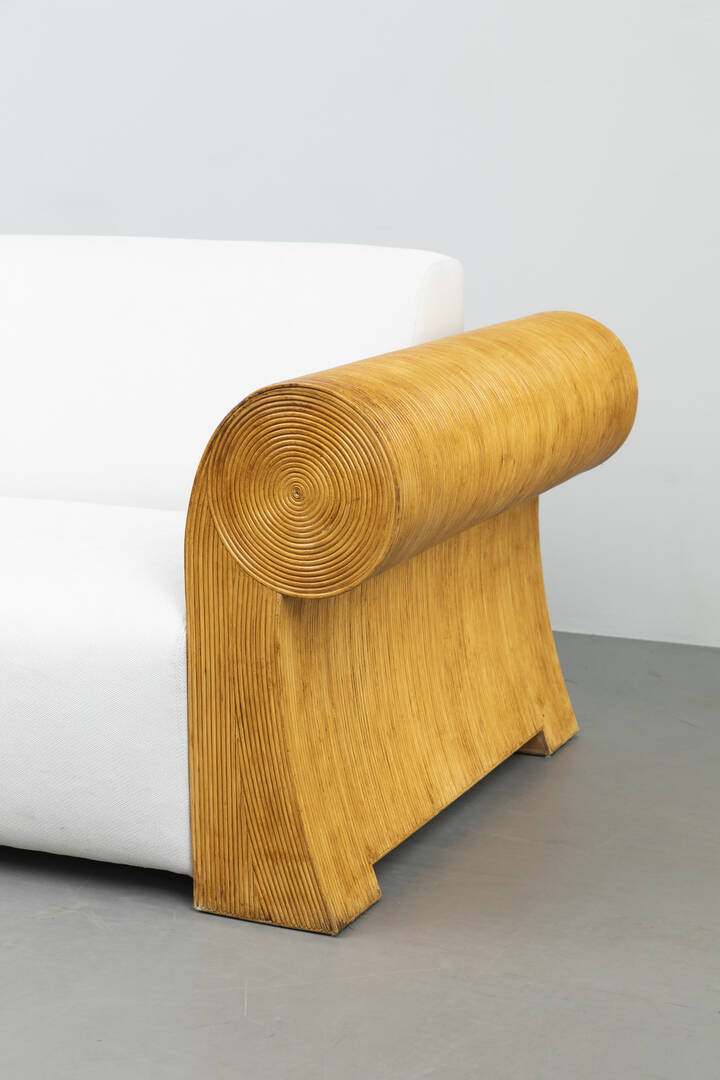 Grande divano con struttura in legno e canna d'India, imbottitura rivestita in tessuto.