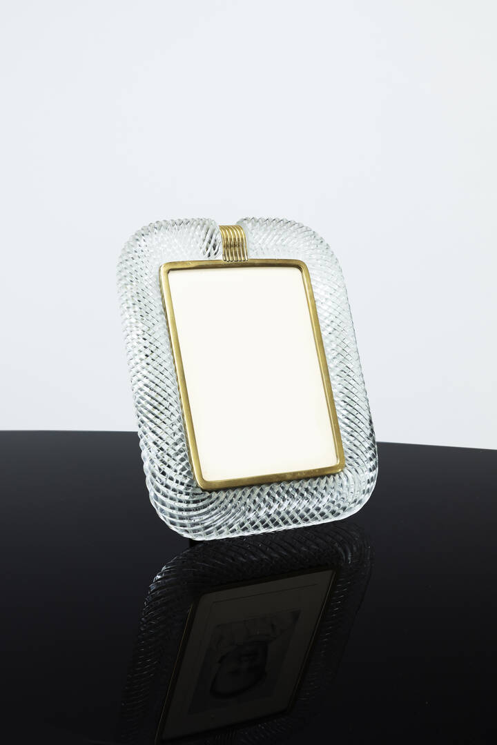 Portafoto in vetro lavorato a torchon, particolari in ottone.