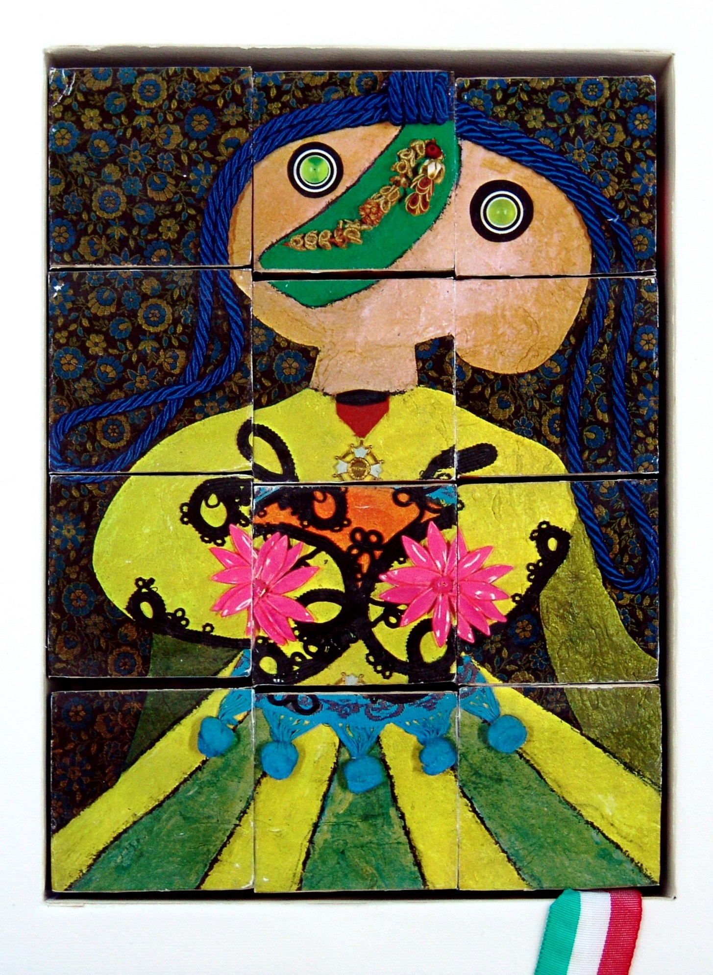libro d'arte con mosaico di 12 cubi in legno, 34x25x8 cm