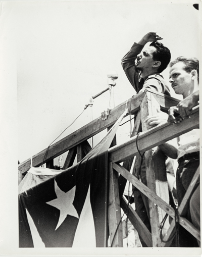 ALBERTO KORDA (1928 – 2001) Capitano Mendoza ad un comizio 26 Luglio 1962 stampa ai sali d'argento vintage 25x20 cm titolato sul retro timbro sul retro Studios Korda Capitano Mendoza ad un comizio 26th July 1962 vintage silver print 25x20 cm titled on the verso Studios Korda's credit stamp on the verso