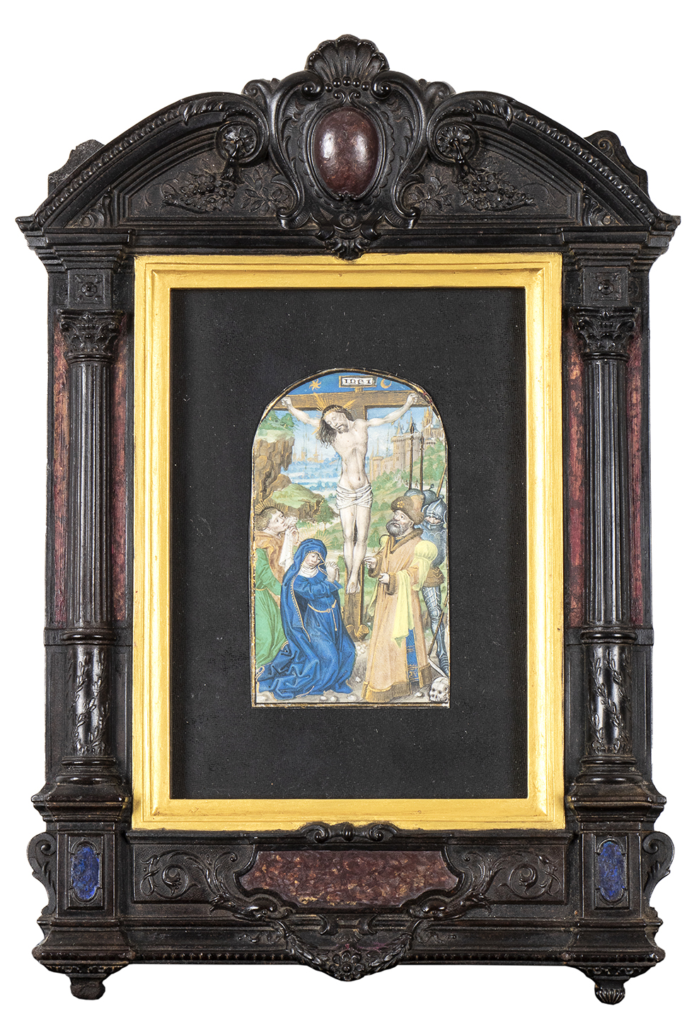 La miniatura è collocata entro una cornice moderna a tabernacolo.