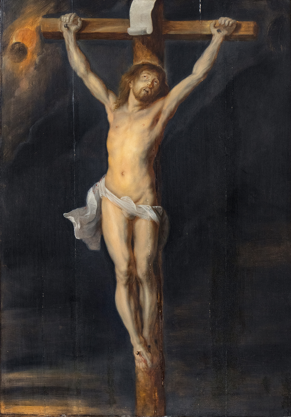 Il dipinto va ricondotto alla produzione di Rubens del secondo decennio del XVII secolo. L’impianto compositivo di questa superbo dipinto su tavola, più volte ripreso da Rubens e dal suo atelier, fu tradotto a stampa da Paul Pontius nel 1631 (in formato centinato, con la veduta di Gerusalemme sullo sfondo e l’aggiunta, ai lati della croce, degli angeli che scacciano i demoni) utilizzando un disegno preparatorio oggi conservato al museo Boymans van Beuningen di Rotterdam. Un disegno autografo a penna e acquarello bruno testimonia la genesi della tipologia a cui corrisponde anche il nostro dipinto, di cui sono note altre versioni più o meno estesamente autografe, fra loro sottilmente variate. Si ricordano soprattutto le redazioni della Wallace Collection di Londra, del Koninklijk Museum voor schinen Kunsten di Anversa, della Bob Jones University di Greenville e del Gemeentemuseum Hof van Busleyden a Malines.