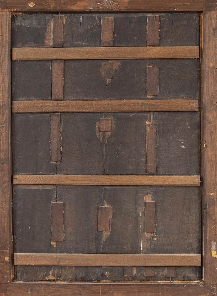 Al retro la tavola reca inciso sul legno il marchio della corporazione dei carpentieri di Anversa col motivo del castello e delle due mani.
