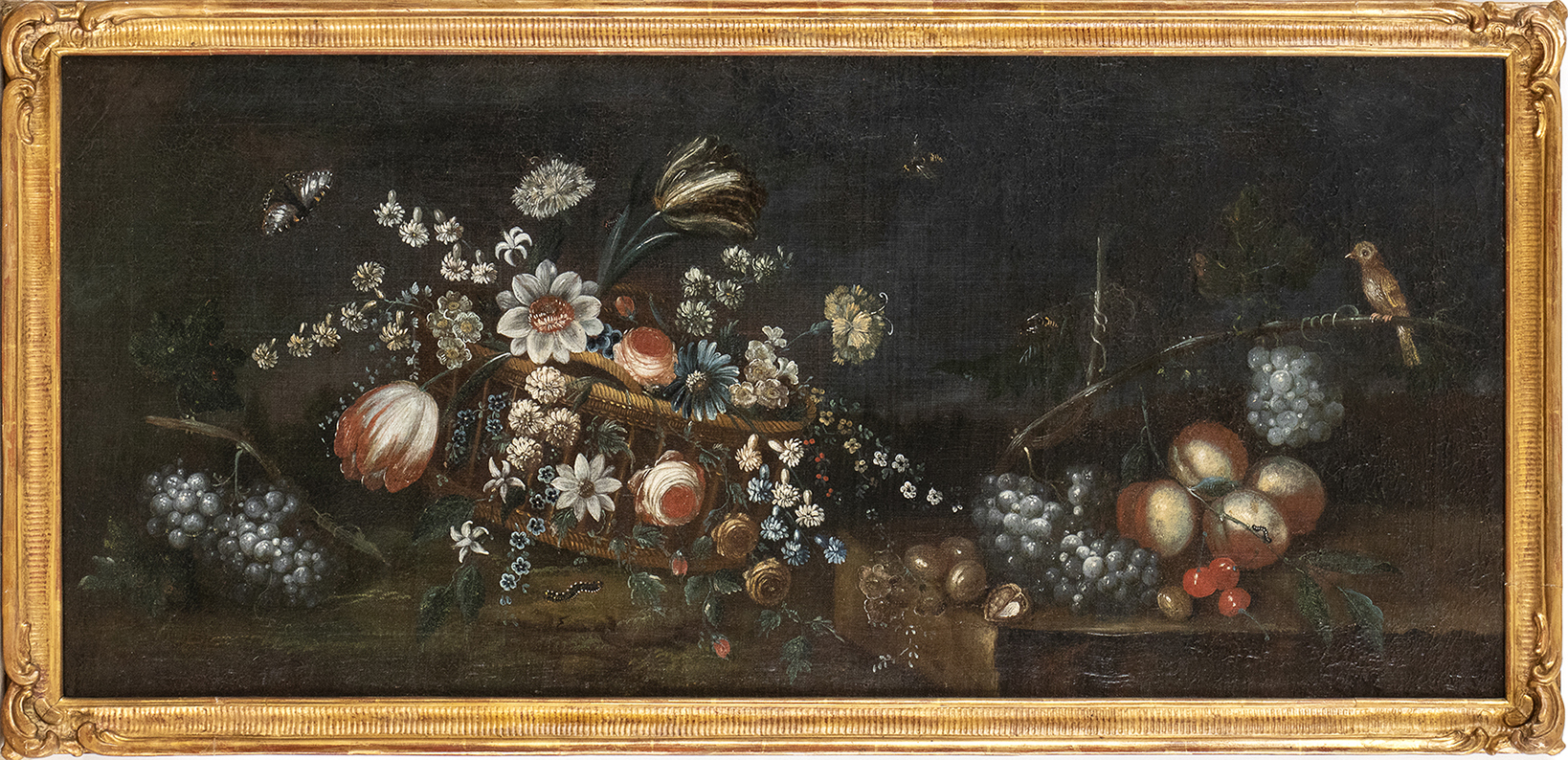 Natura morta con canestro di fiori, frutta su un ripiano e un uccellino