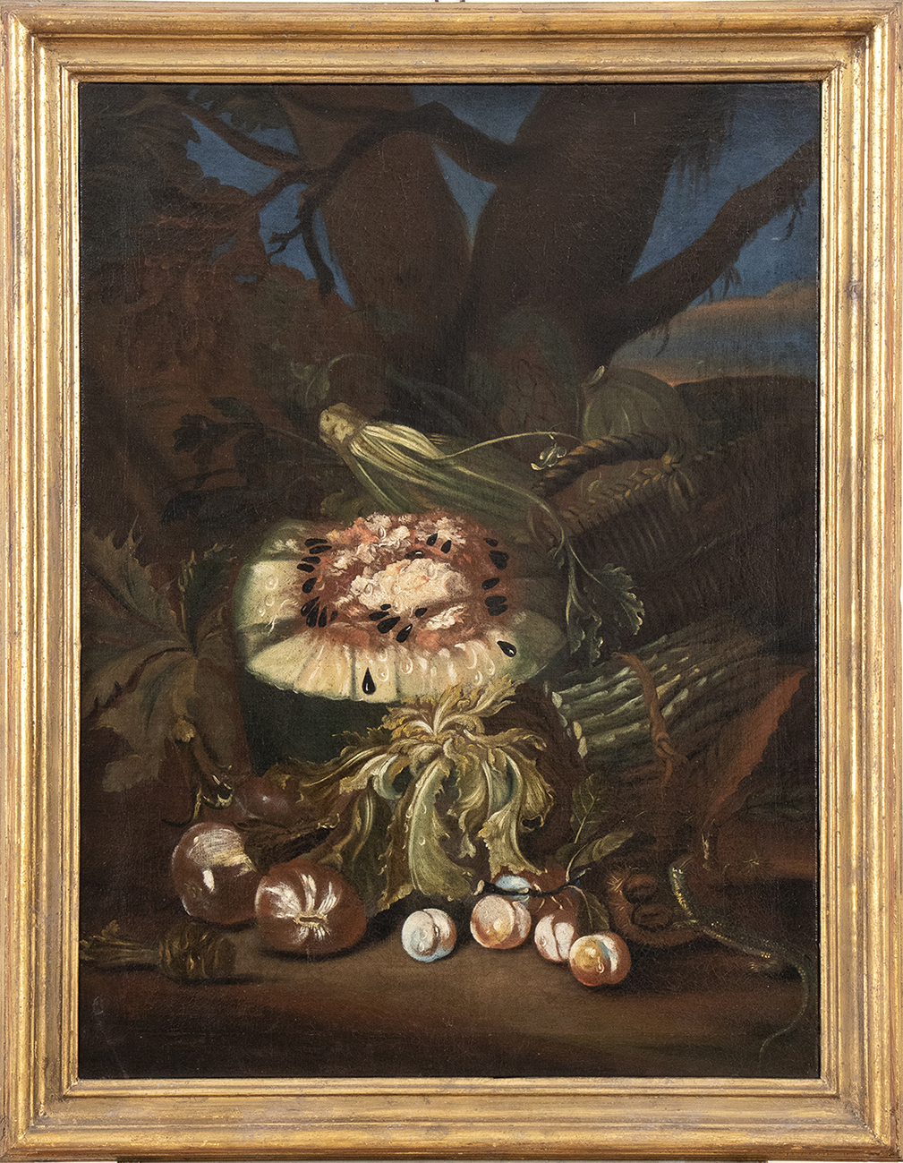 Natura morta en plein air con anguria, asparagi e ramarro