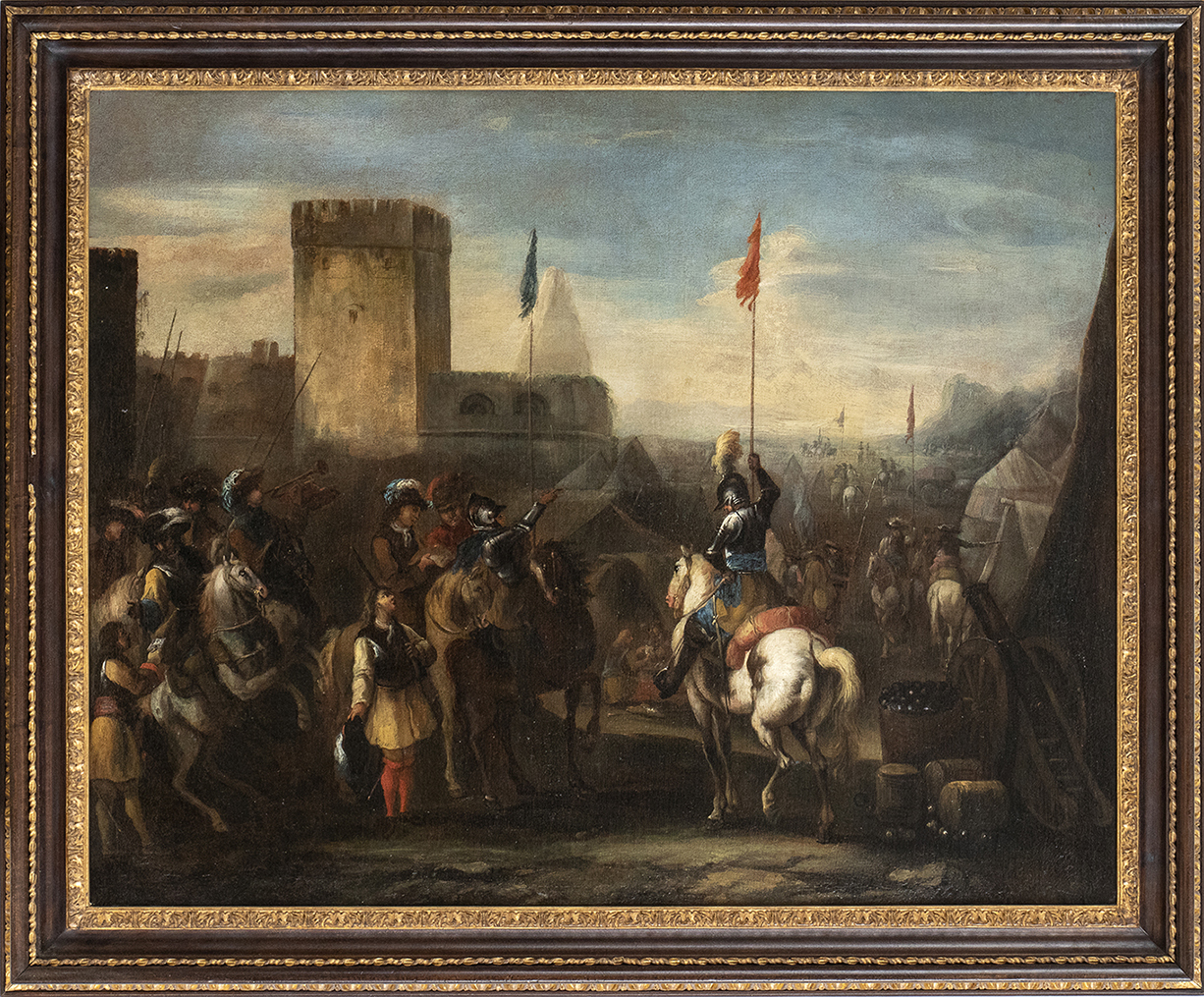 In questa scena composita, raffigurante un’adunata di cavalleria in un accampamento militare di fronte alle mura nemiche, forse in vista di un prossimo attacco, si può riconoscere la mano del veronese Antonio Calza, tra i migliori seguaci del Borgognone tra la fine del XVII e il primo quarto del XVIII secolo. Paragoni convincenti possono essere istituiti con numerosi dipinti del pittore, fra cui si segnalano lo Schieramento dell’esercito prima della battaglia (Torino, coll.privata), lo Scontro di cavallerie (Verona, Museo di Castelvecchio), Dopo la battaglia (Parma, coll. Privata), la Resa di una città (Già Finarte, Milano, 21/11/1974, n. 43).