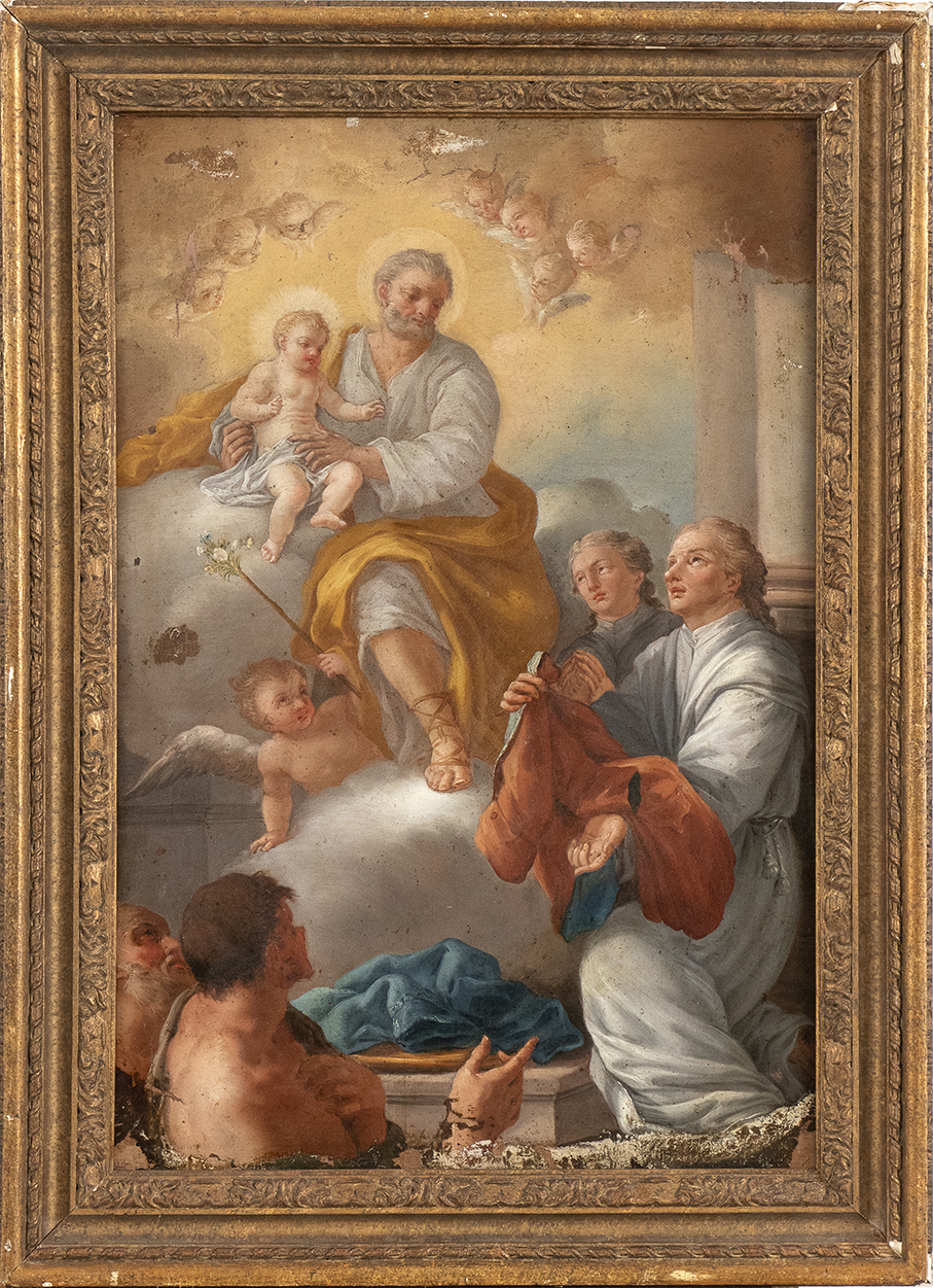 Santo che dona lo scapolare a Giuseppe e Gesù Bambino