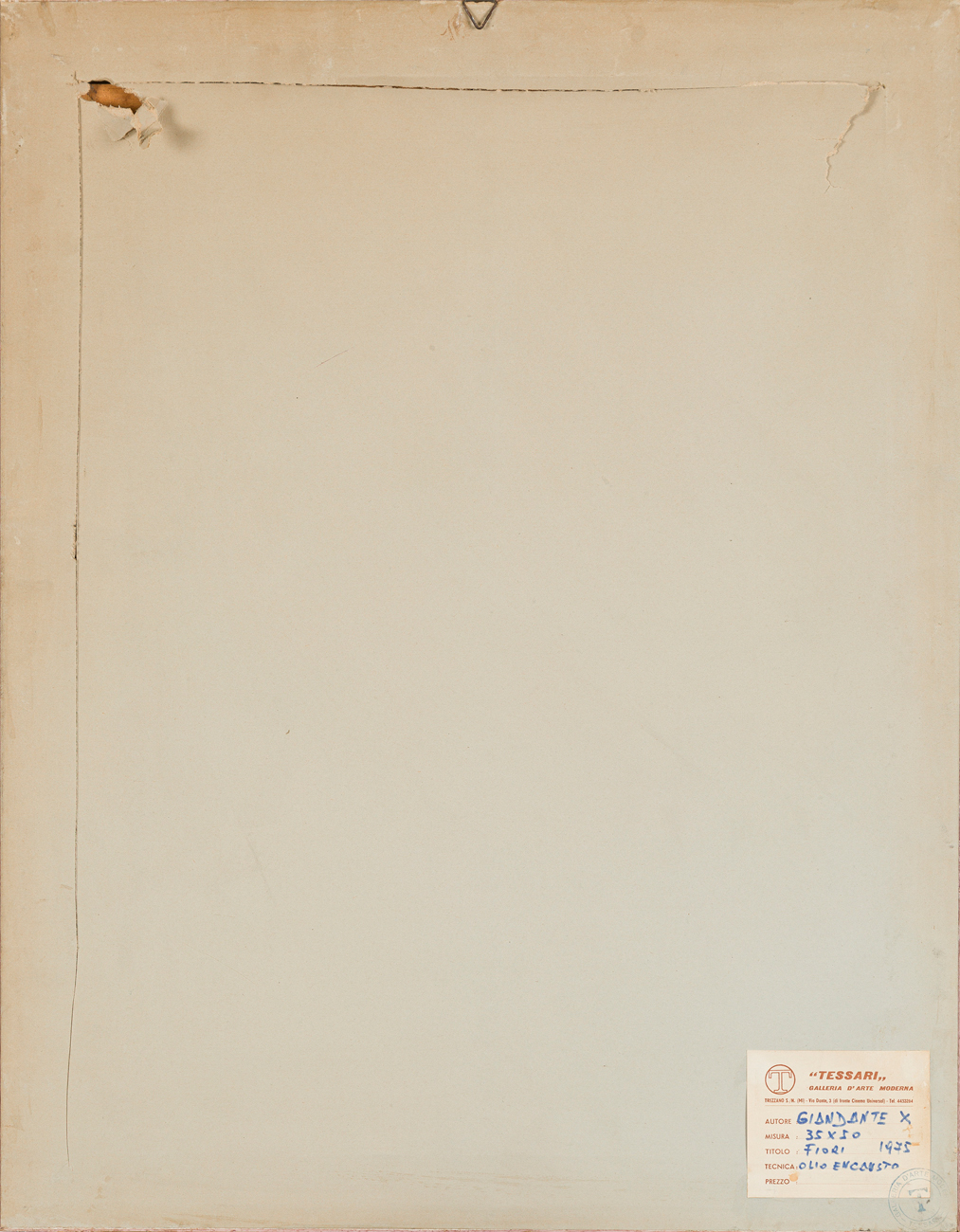 Etichetta e timbro della Galleria d'Arte Moderna Tessari (MI) al retro del cartone protettivo