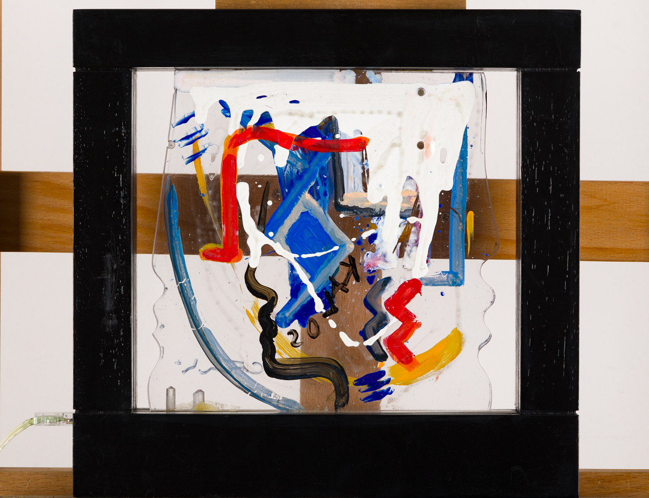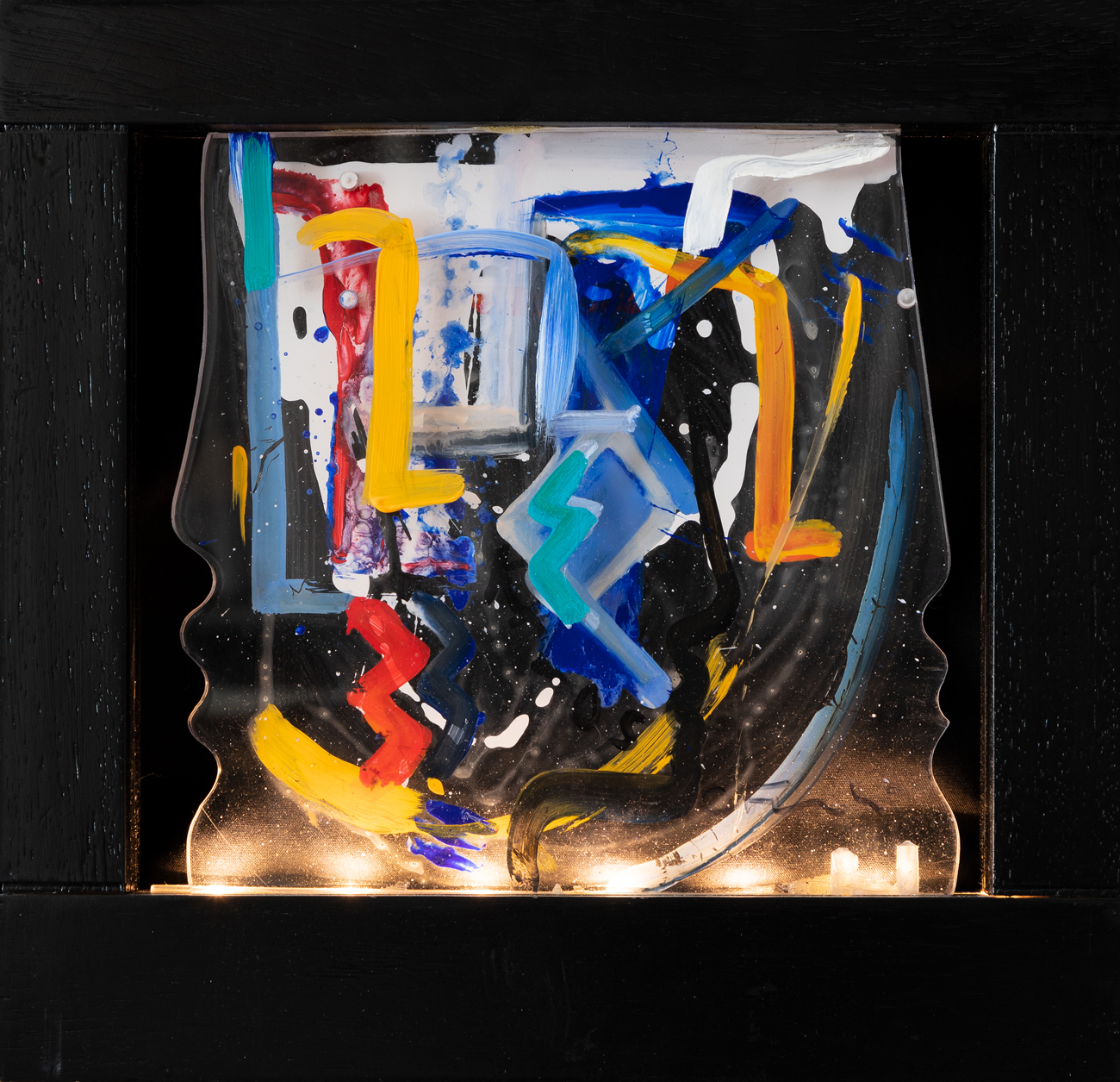 Tecnica mista su plastica sagomata entro cornice in legno - Opera luminosa (funzionante)