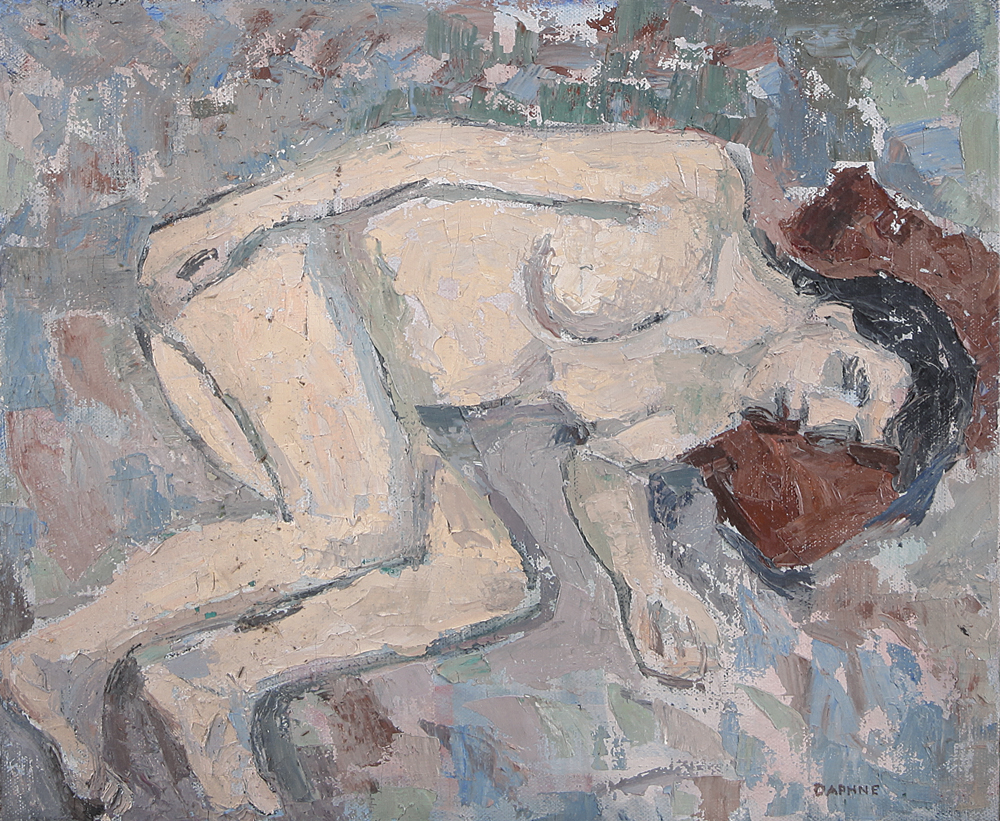MAUGHAM DAPHNE CASORATI Londra 1897 - Torino 1982 Nudo disteso olio su tela cm. 50x60, firma in basso a destra, dichiarazione d'autenticità del figlio Francesco datata Torino 6/03/2003 al retro.