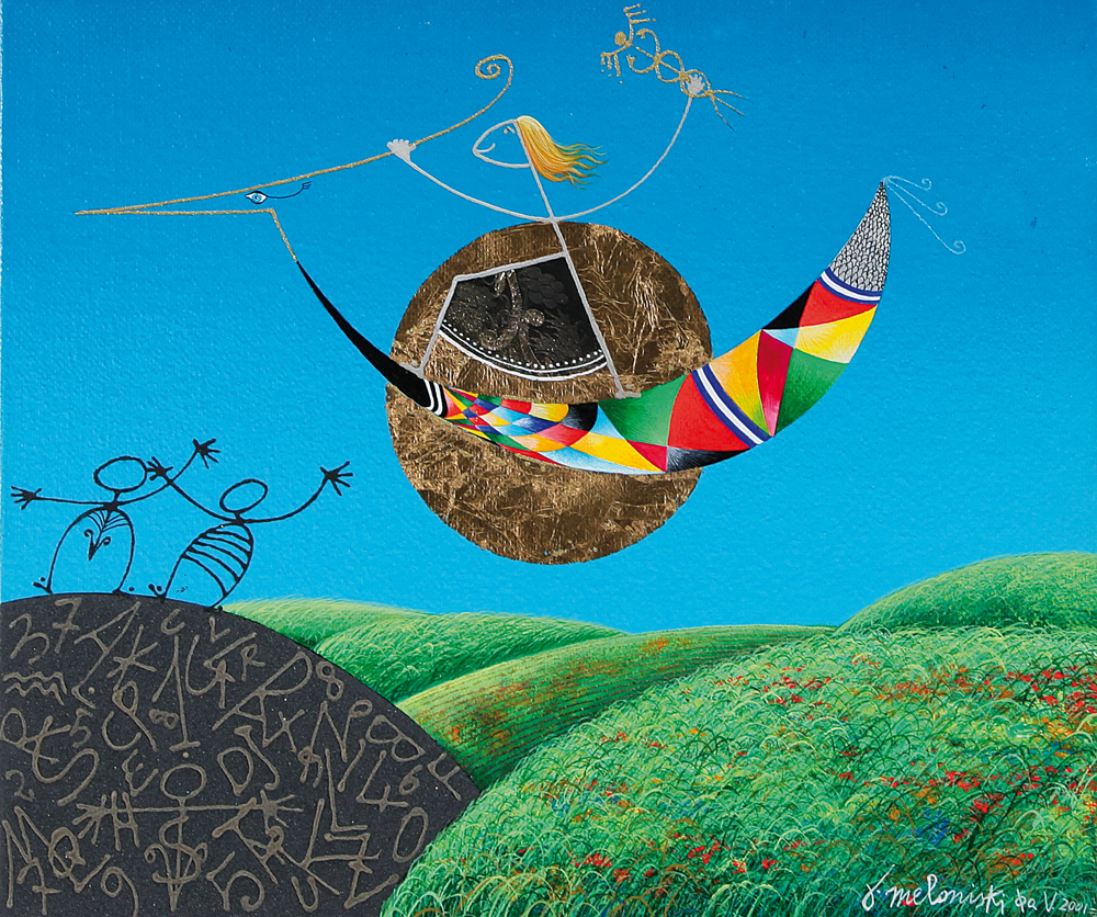MELONISKY DA VILLACIDRO Villacidro (Sardegna) 1943 L'arca del saggio tecnica mista su tela cm. 50x60, firma e anno in basso a destra, firma, titolo e anno al retro.