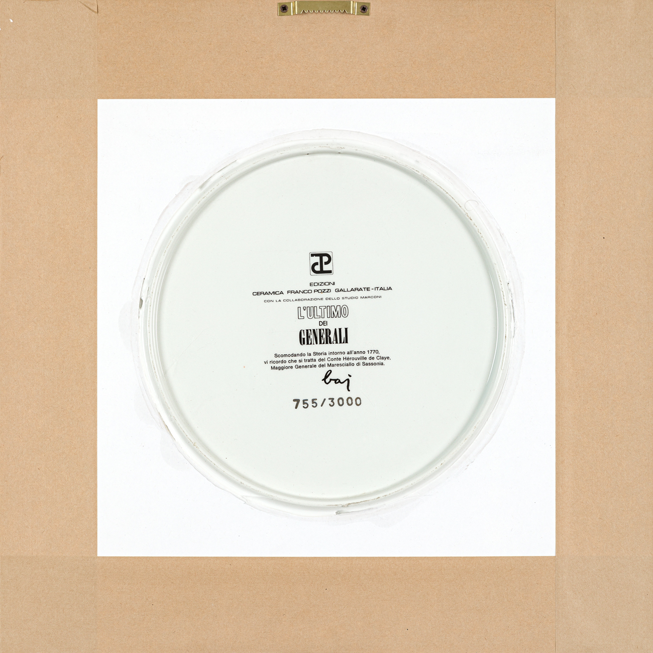 Firma in lastra, numerazione (Esemplare 755/3000) e marchio Edizioni Ceramica Franco Pozzi Gallarate al retro