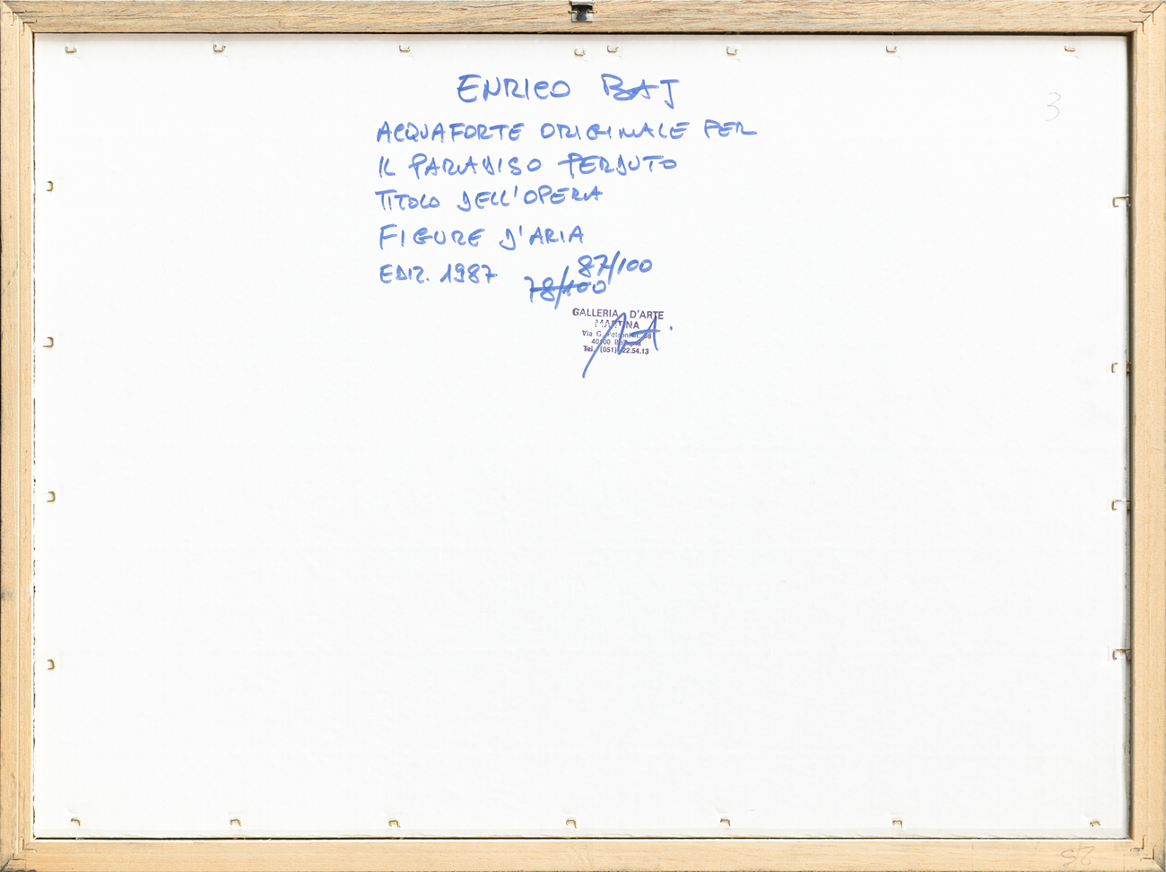Timbro della Galleria d'Arte Martina (BO) al retro del cartone protettivo