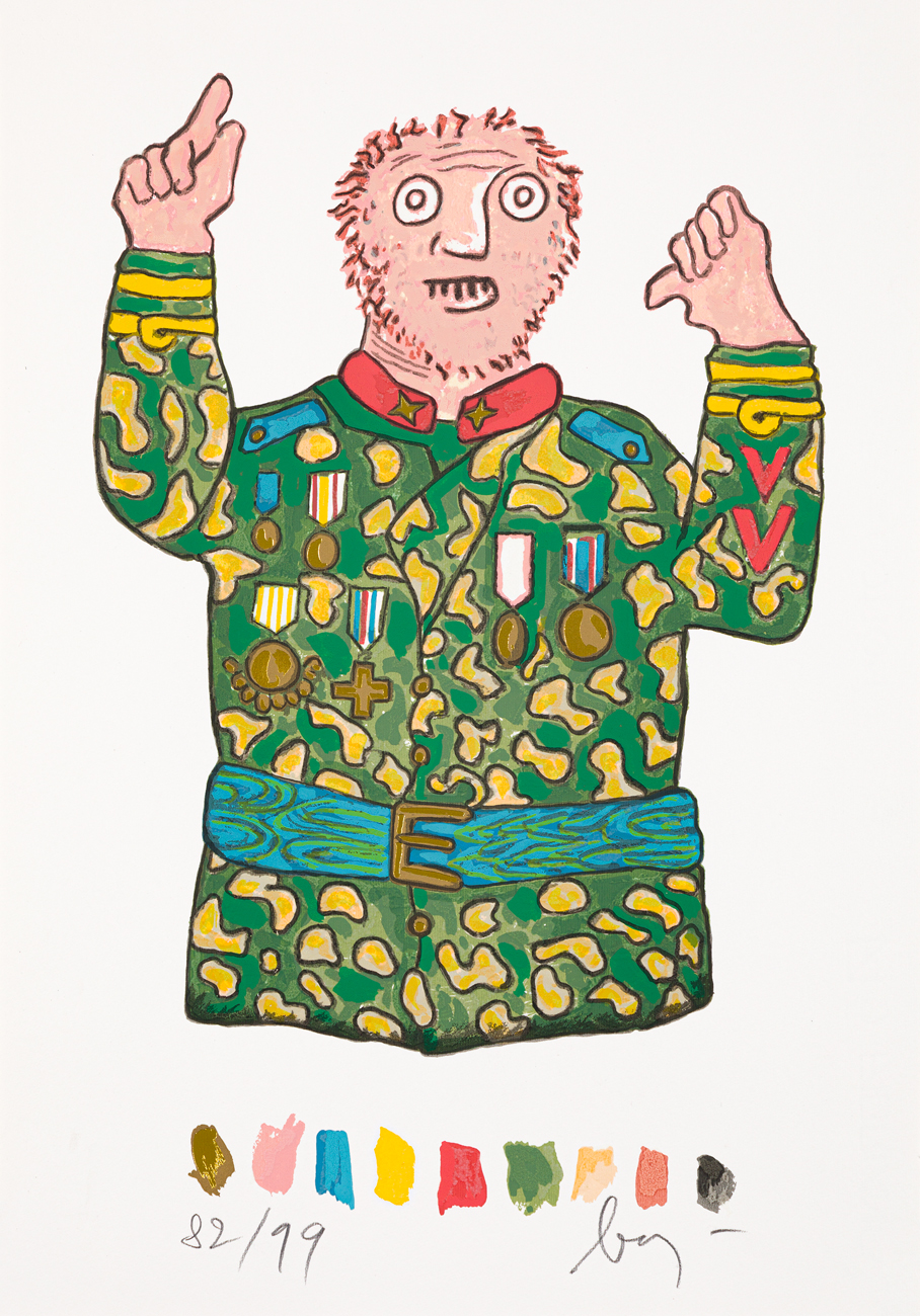 Cartella contenente testo di presentazione di Roberto Sanesi e una serigrafia polimaterica di Enrico Baj recante firma e numerazione (Esemplare 82/99) a matita al fronte