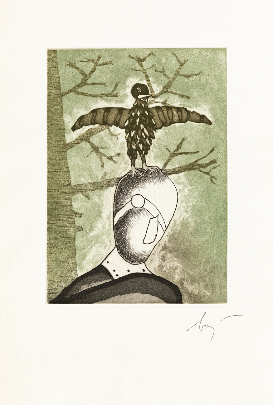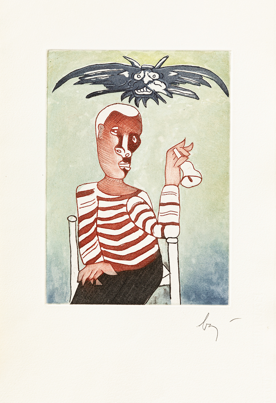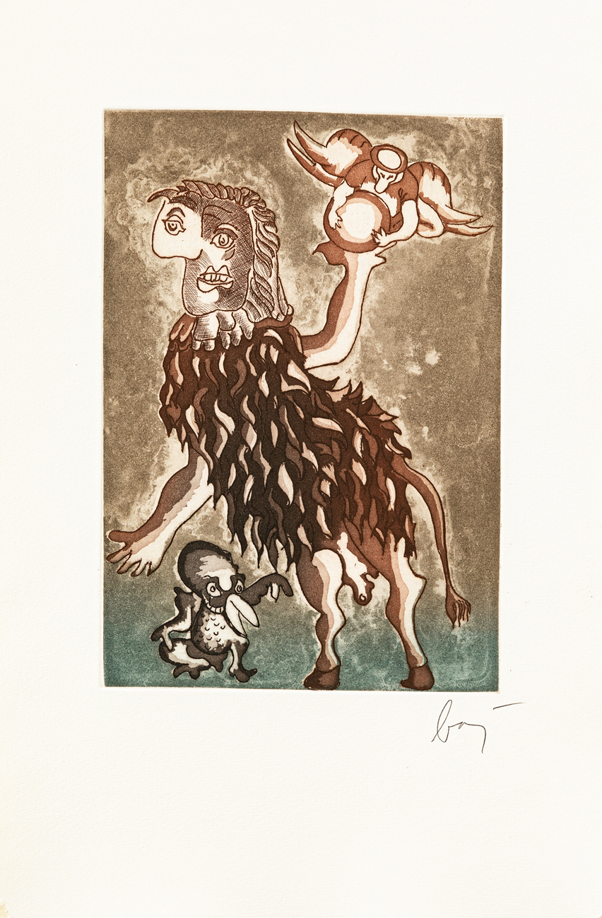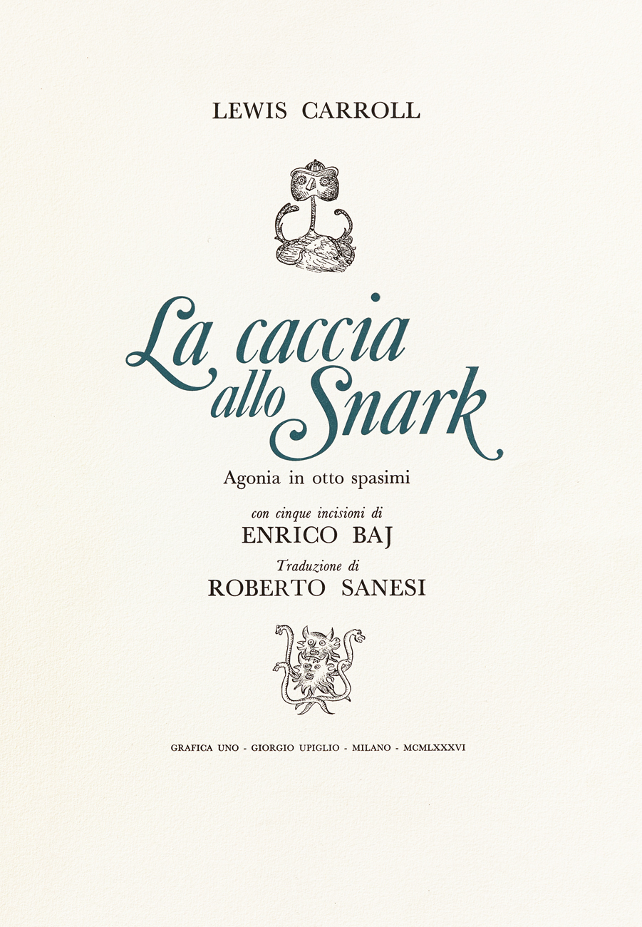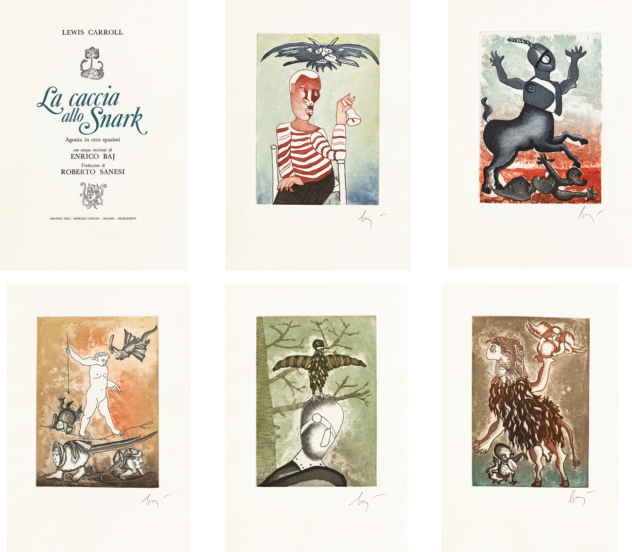 Edizione in-folio composta da 54 pagine con testi tratti da 'La caccia allo Snark' di Lewis Carroll nella traduzione di Roberto Sanesi e 5 incisioni originali all'acquaforte e all'acquatinta di Enrico Baj, fuori testo e sciolte, ciascuna recante firma a matita in basso a destra