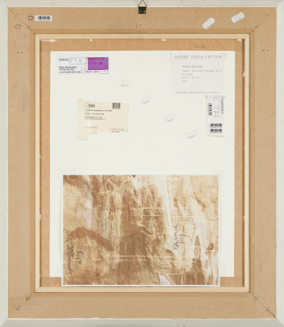 Etichetta della Galerie Gisela Capitain (Colonia) al retro del cartone protettivo