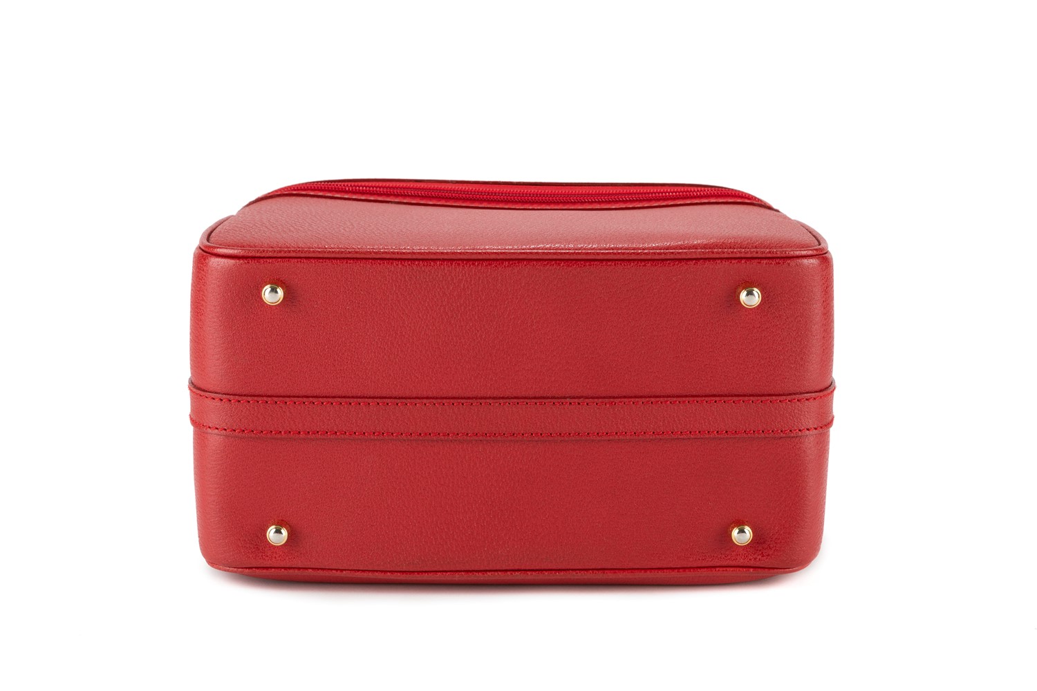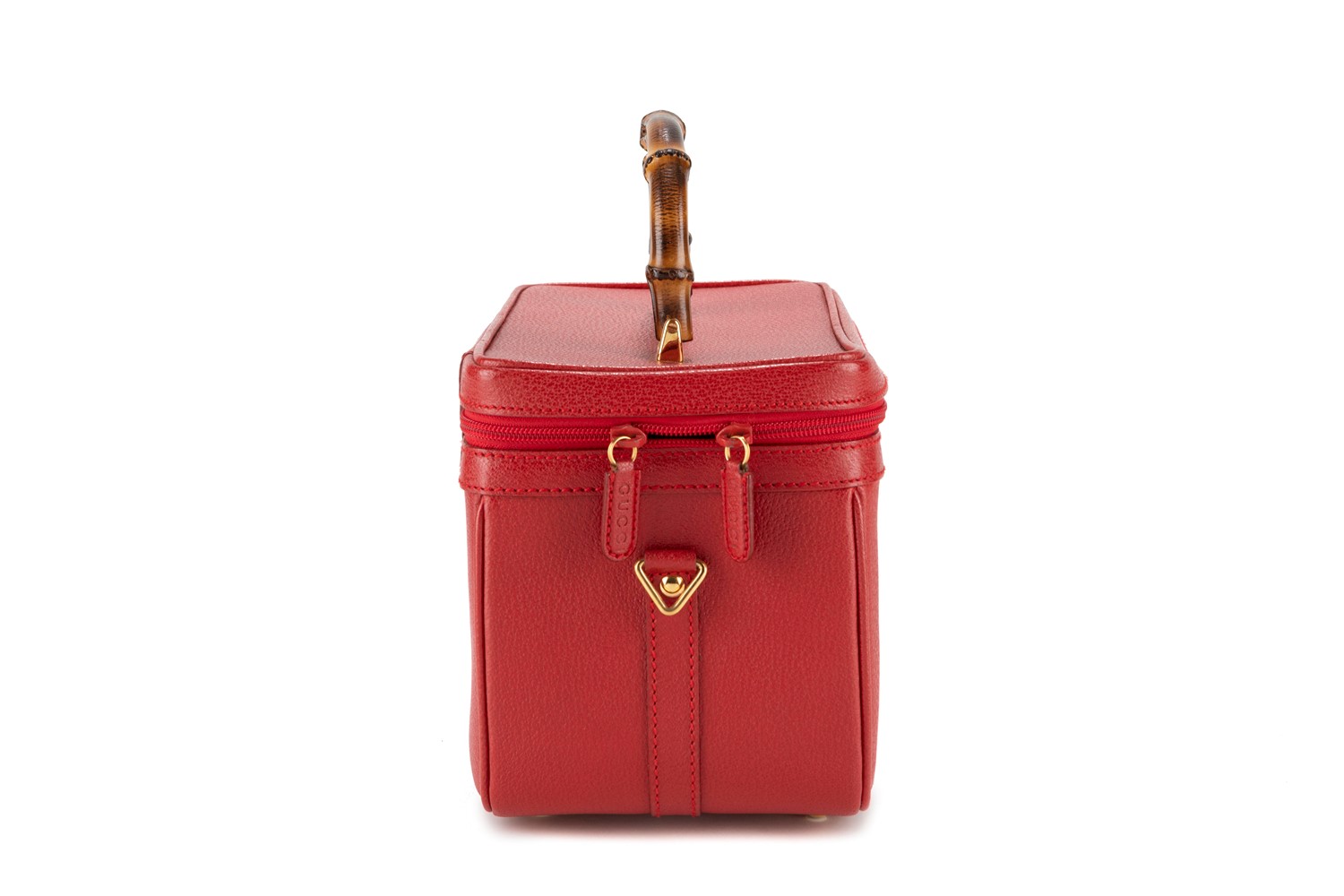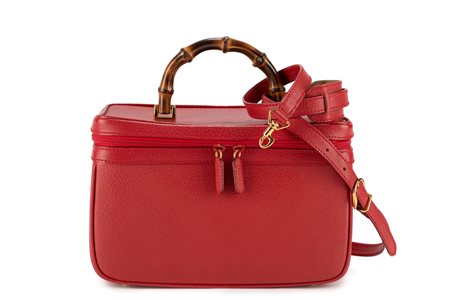 in pelle di cinghiale color rosso, manico in bamboo, tracolla staccabile, cm 30x15x19, con sacchetto (lievi difetti).
