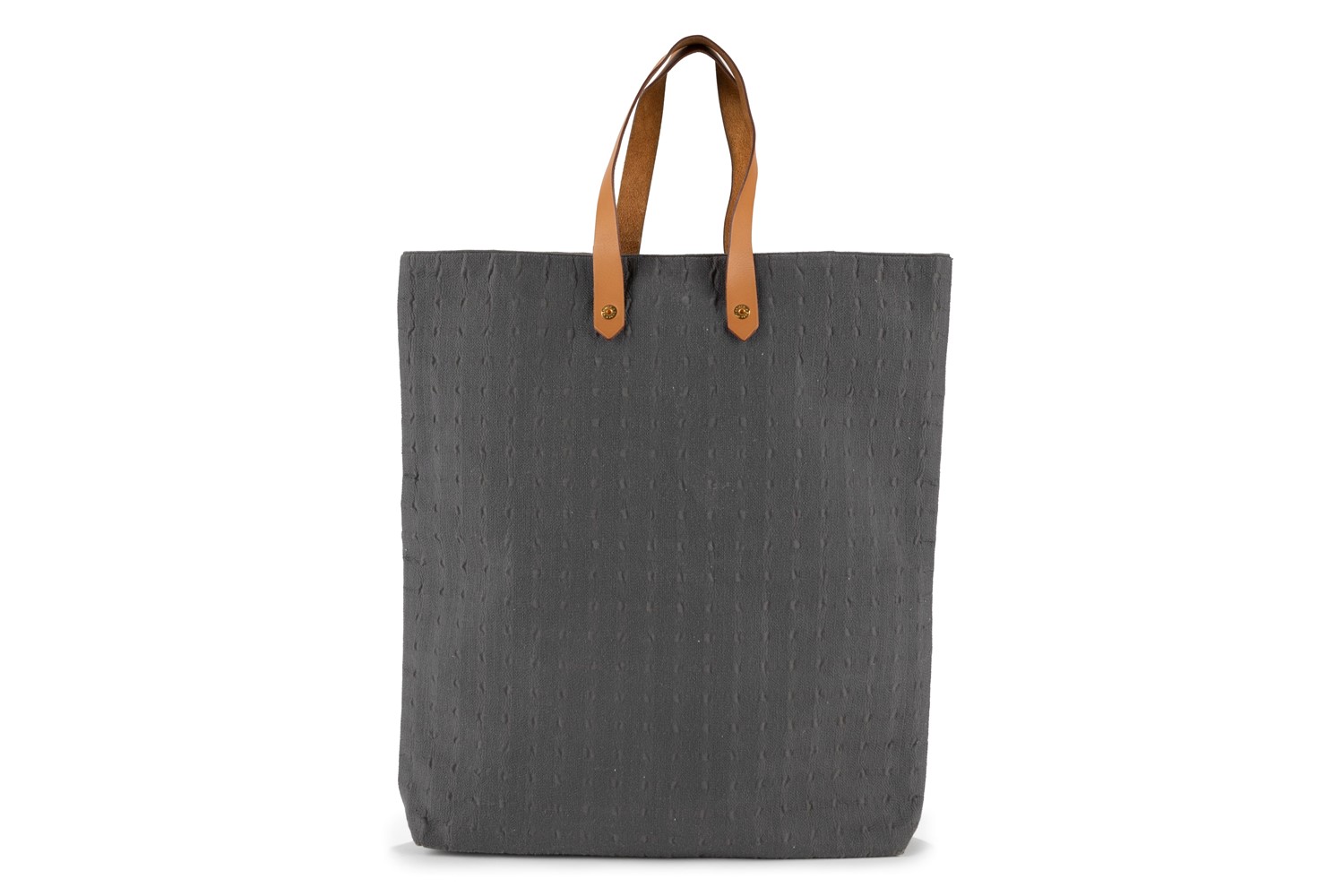 in tela lavorata color grigio piombo, doppi manici in cuoio, cm 32x40 (lievissimi difetti).
