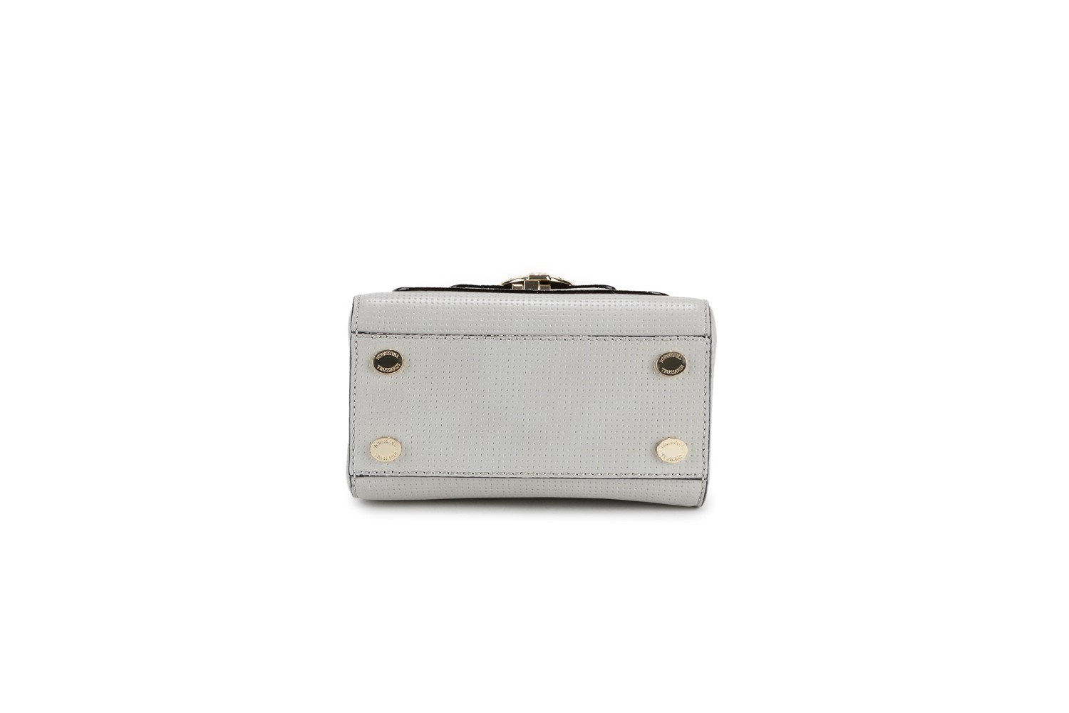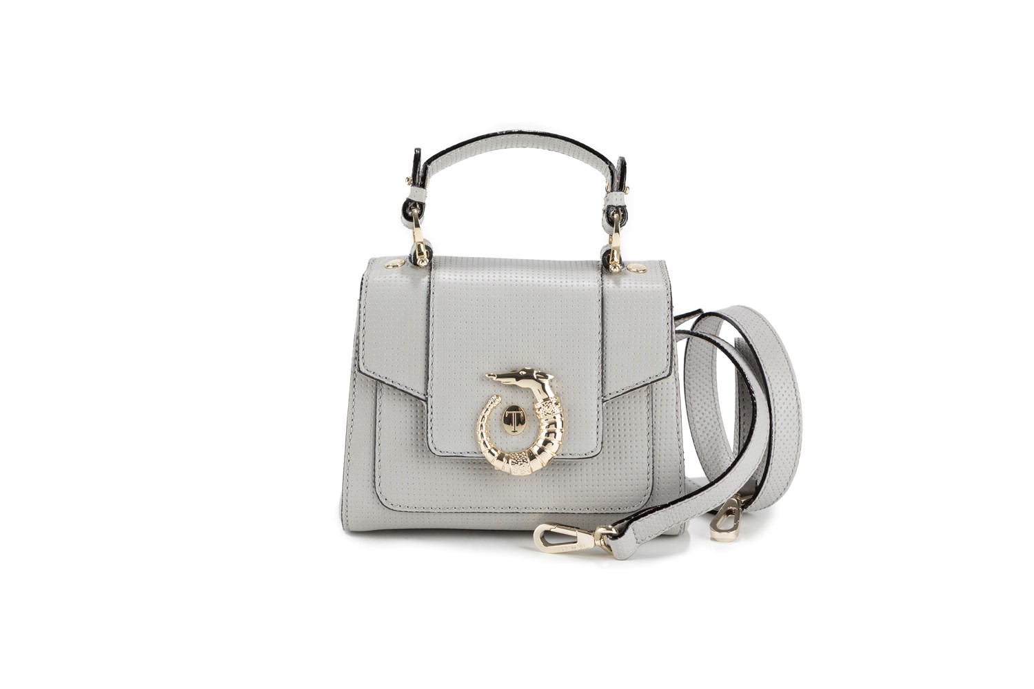 in pelle color grigio chiaro con manico e tracolla staccabile, dettagli in metallo a forma di levriero stilizzato, cm 18, con sacchetto.