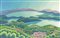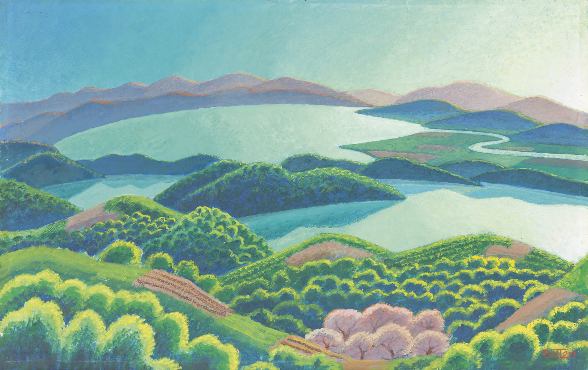 una veduta di paesaggio collinare umbro, in cui si inseriscono alcuni laghi idealizzati secondo il consueto linguaggio dottoriano, come