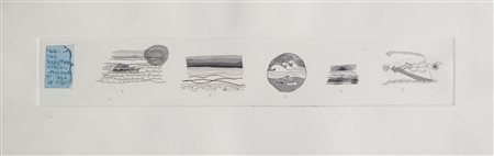 Gastone Novelli (Wien/Vienna 1925 – Mailand/Milano 1968) Tavola che illustra cinque movimenti per le acque, 1966;Puntasecca col., 35 x 84,5 cm (foglio), 10,5 x 53,5 cm (lastra), timbro