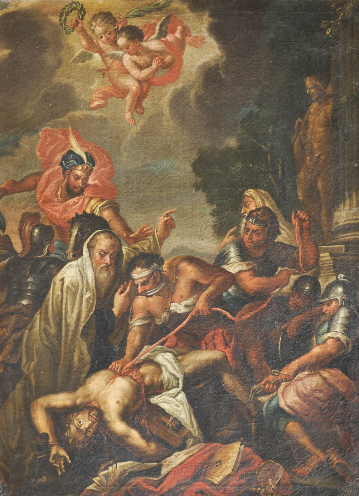 Nachfolger/seguace Nicolas Poussin, 18. Jh. Martirio di Sant‘Erasmo;Olio su tela, 105 x 77 cm, restaurato e rintelato, in cornice