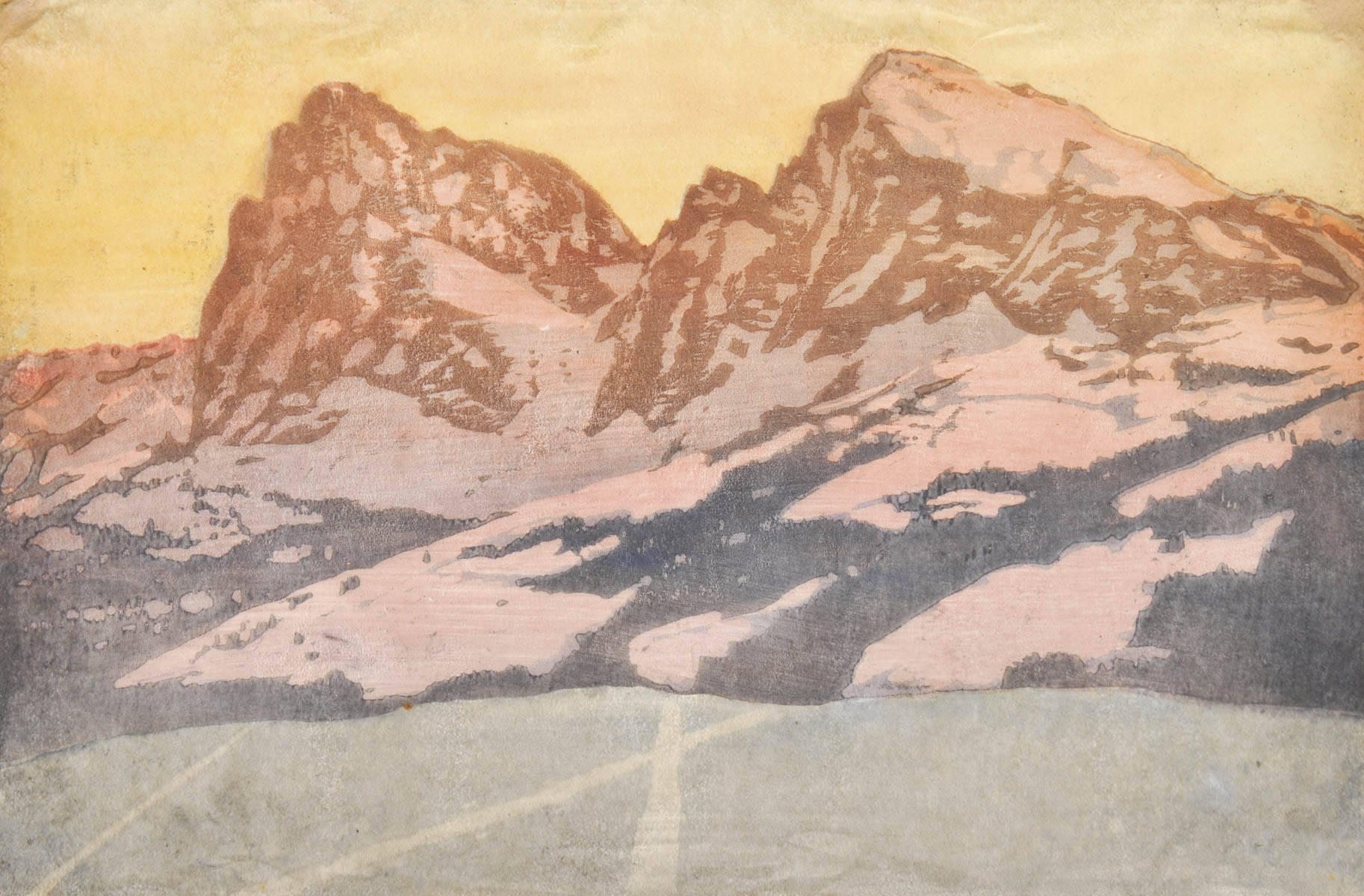 Max Sparer (Söll, Tramin/Termeno 1886 – Bozen/Bolzano 1968) Sassopiatto e Sassolungo in inverno;Xilografia a colori, 30 x 45 cm, in cornice