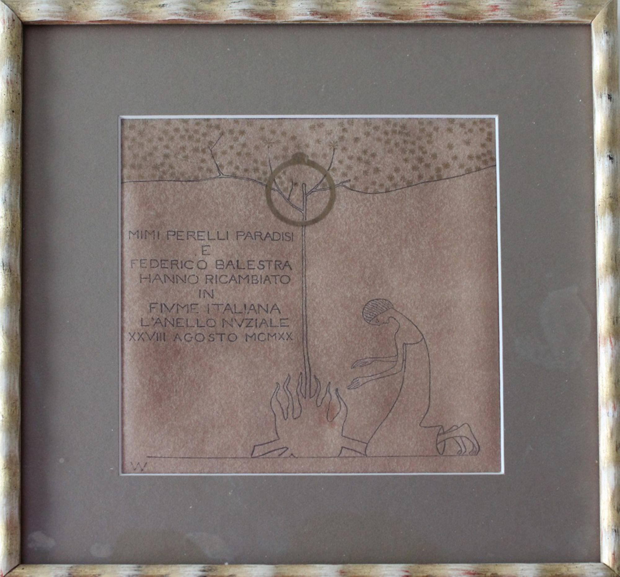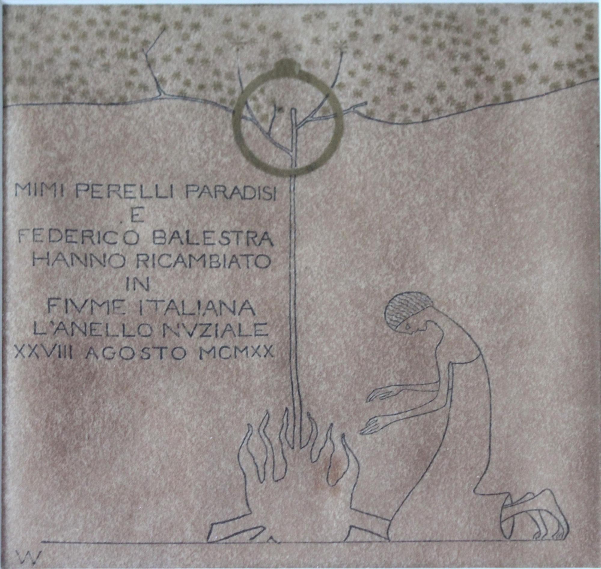 partecipazione per le nozze di Mimi Perelli Paradisi e Federico Balestra Erminia (Mimi') Paradisi nata dai conti Perelli, Federico Balestra, marchese di Mottola (Puglia), ufficiale alla corte di D'Annunzio a Fiume