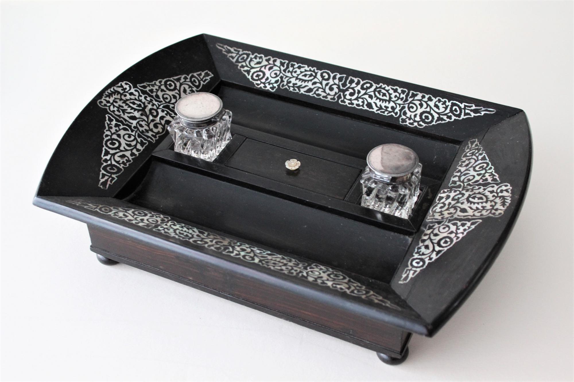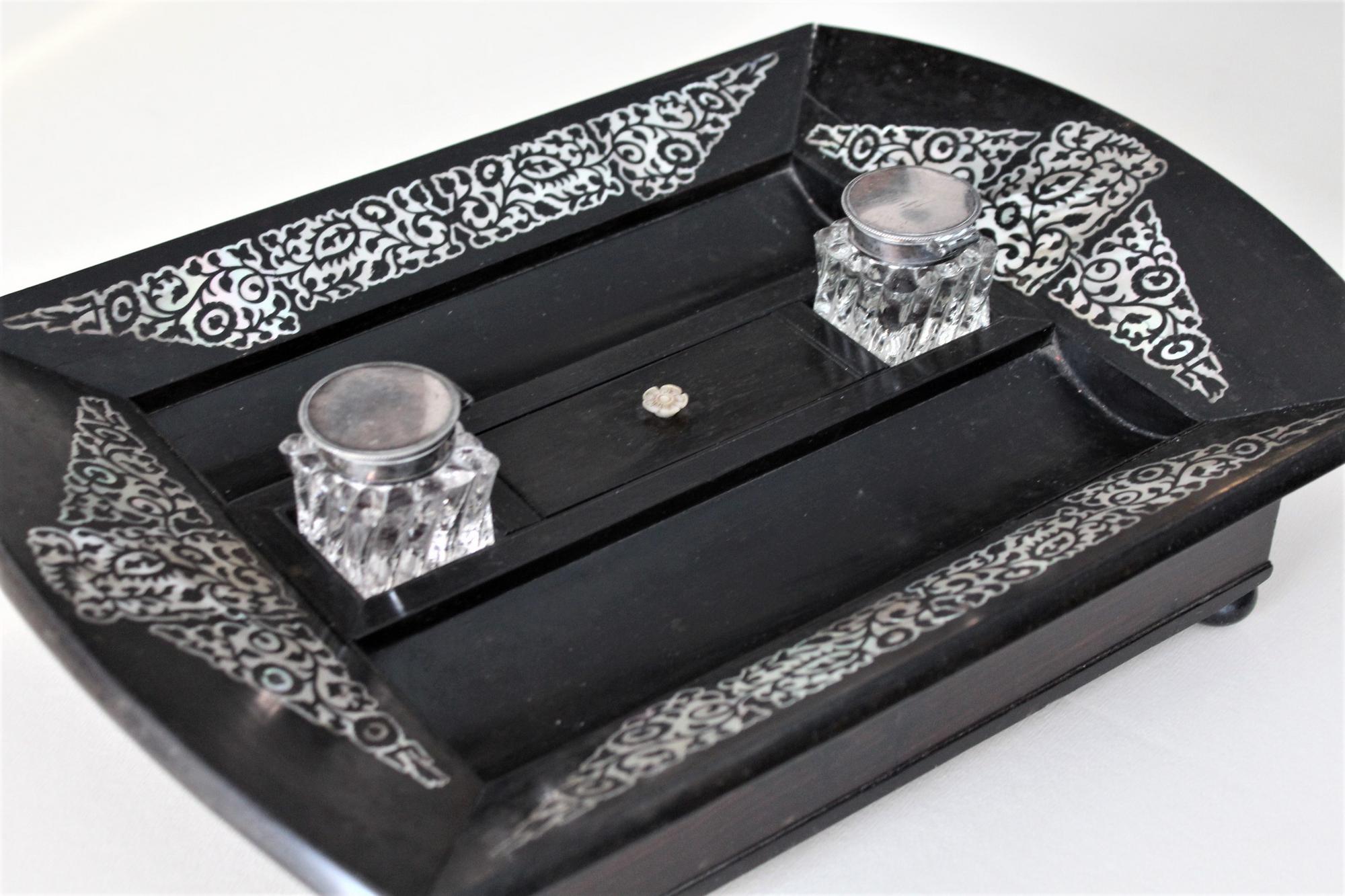 calamaio in legno ebanizzato con inserti in madreperla, bicchieri in cristallo con coperchio in argento, cm 10x37x27