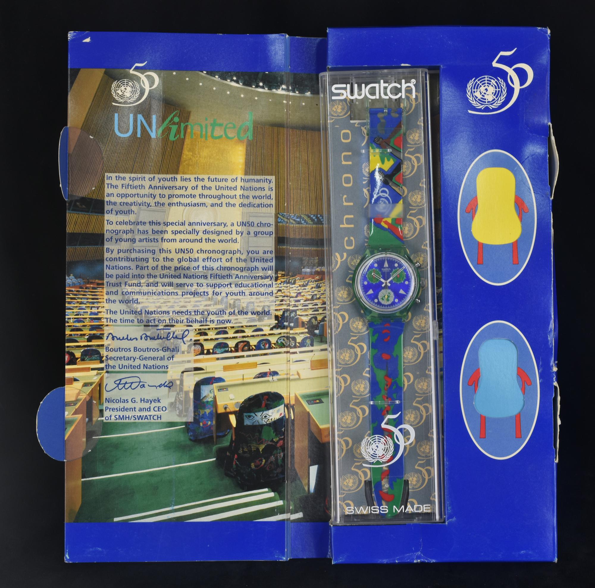 SWATCH 50 ANNIVERSARIO NAZIONI UNITE nuovo e inusato entro scatola e astuccio...