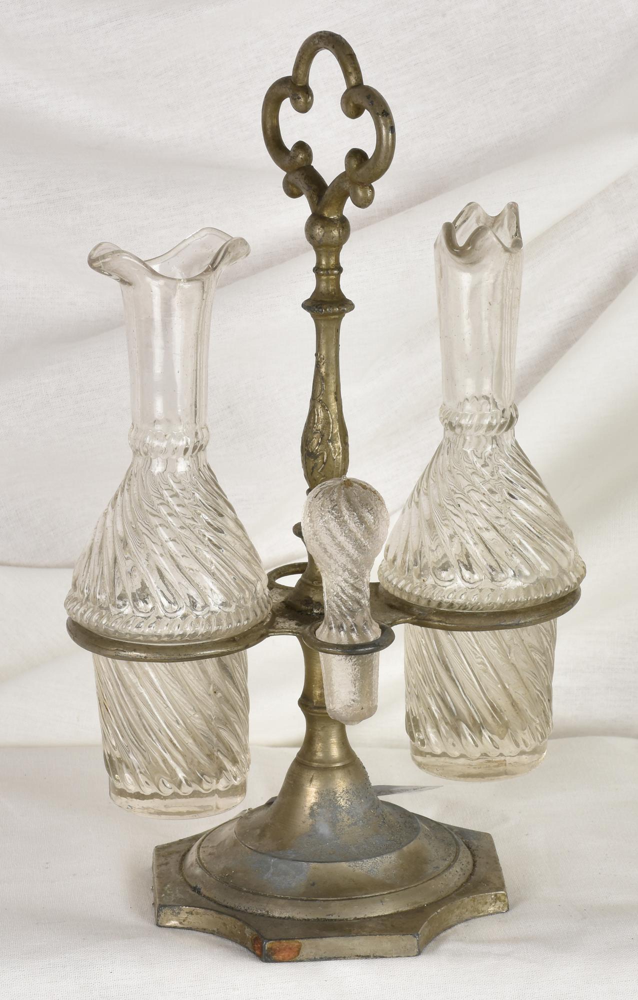 Lot 48 | ACETOLIERA in metallo, con ampolle in vetro soffiato Italia, inizio XX sec. h...